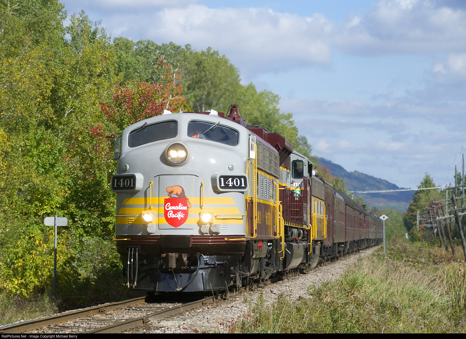 CP's executives are getting a view of their recently repurchased line as business train CP 41B heads west on CP's Sherbrooke Sub with a 12-car train and an interesting lashup of CP 1401, CP 7019 & CP 1900.