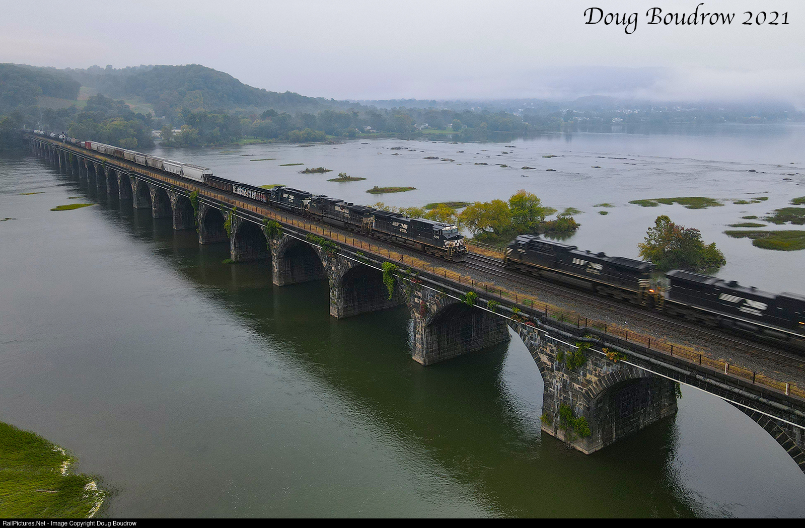 An Eastbound manifest coming out of Enola Yard pauses to let a Westbound intermodal pass on the Rockville Bridge. The stone arch structure was built in 1903 by the Pennsylvania Railroad and was the largest stone arch bridge in the world at that time. The Penn Central heritage unit is second on the consist.