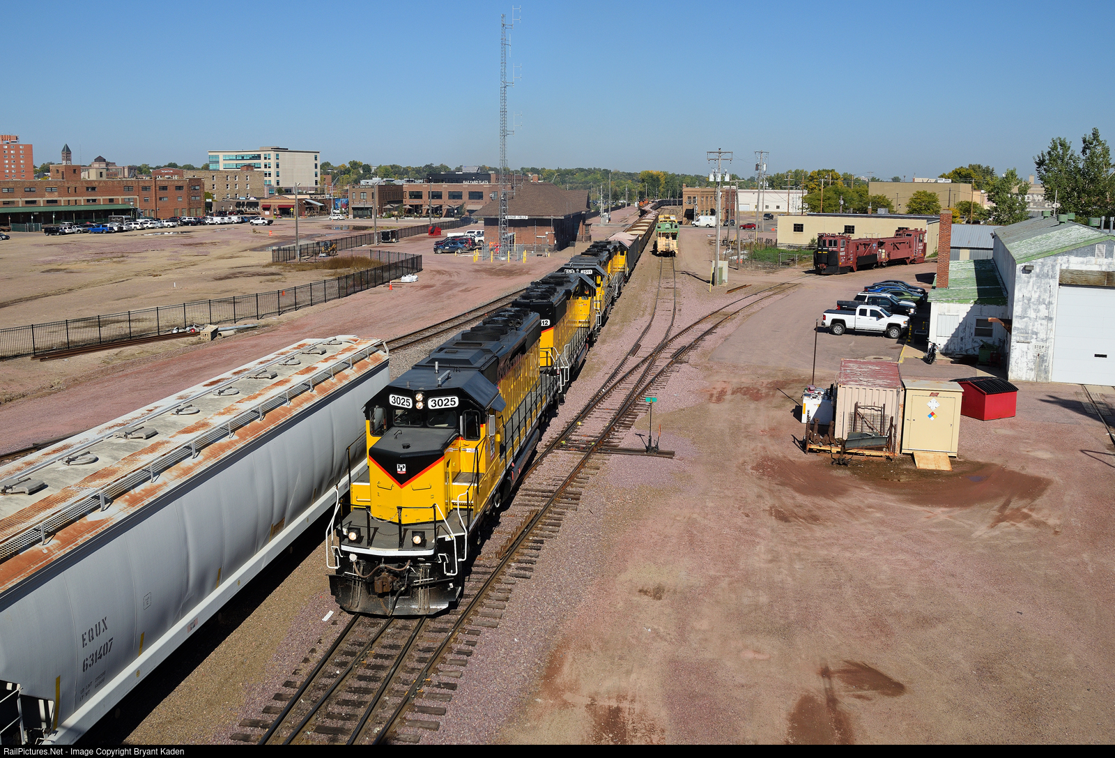 A southbound Dakota & Iowa Railroad train rolls through downtown Sioux Falls, passing the former Great Northern depot, a former BN caboose, and a couple of pieces of snowfighting equipment that, thankfully, aren't needed quite yet this year.