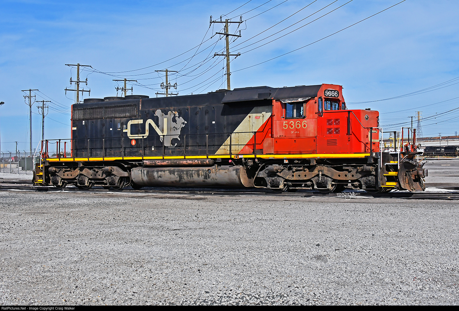 In 1973, when General Motors Electro-Motive Division was inundated with orders for SD40-2s for just about every railroad, twenty SD40-2s were built for Missouri Pacific. Lucky number 13 was MP 807, which the railroad later renumbered 3107. When the UP acquired the MoPac in 1982, MP 3107 became UP 4107. As the UP continued to acquire new locomotive (as well as merge with even more railroads), UP 4107 became surplus and was one of 19 oof this order of SD40-2s sold to Canadian National, which renumbered it CN 6107. Following a rebuild in the mid-1990s, CN 6107 was renumbered CN 5366. By this point, there are nine of the engines from this particular MP order still in service on the CN. Note the shiny new air conditioner on the side of the nose of 5366 as it sits in the railway’s Kirk Yard. (Gary, Indiana – September 24, 2021) Photographed on railroad property with permission and full PPE and Covid precautions.