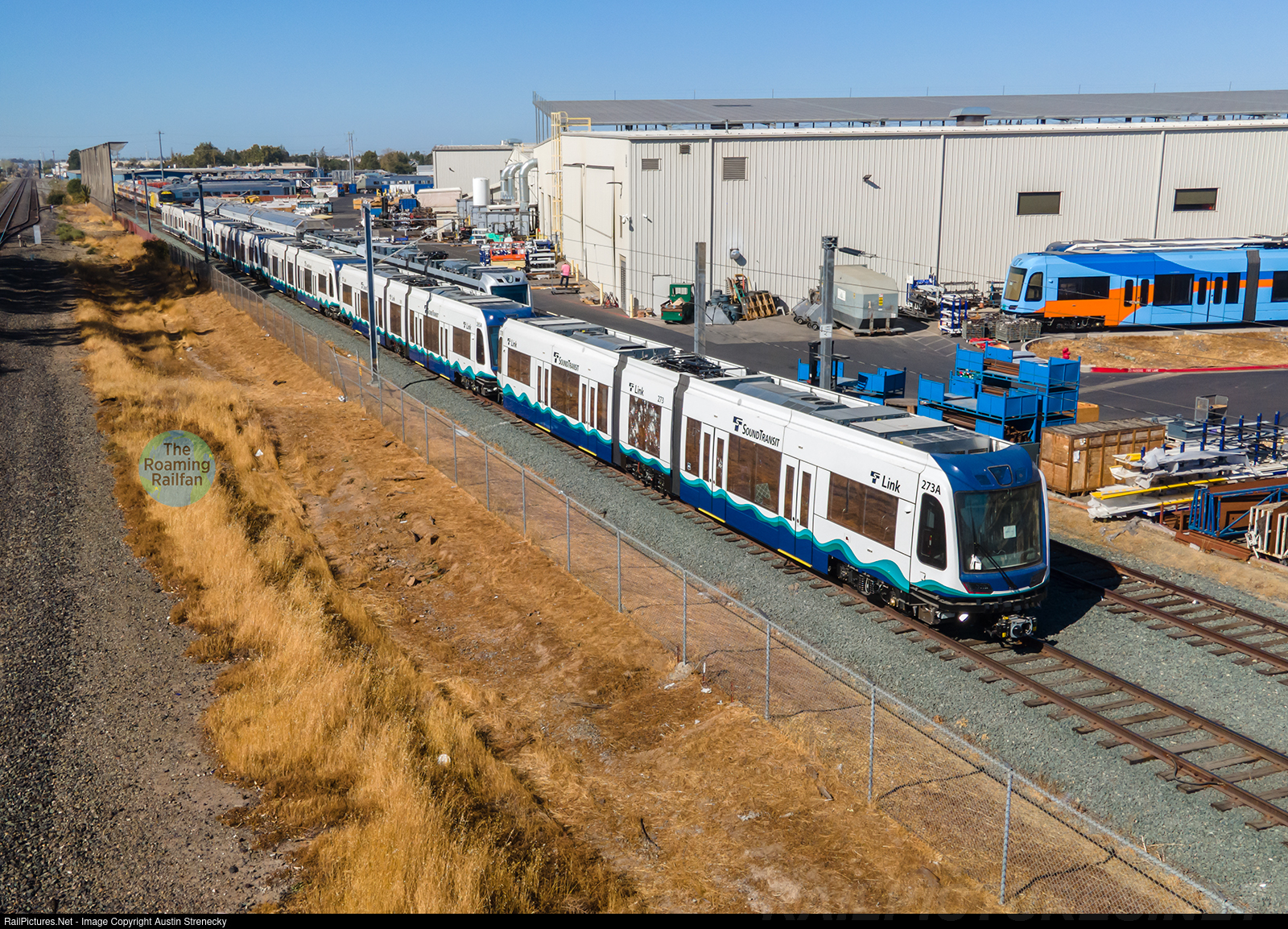 A string of six brand new Sound Transit S700 light rail vehicles sit on the test track at the Siemens Rolling Stock Factory in Sacramento, California. Also shown are light rail vehicles for the OC Streetcar and San Francisco Muni, coaches for Amtrak Midwest, Brightline's BrightRed trainset, unfinished shells for Via Rail and Amtrak coaches and locomotives, and even a shell for a Via Rail cab car.
