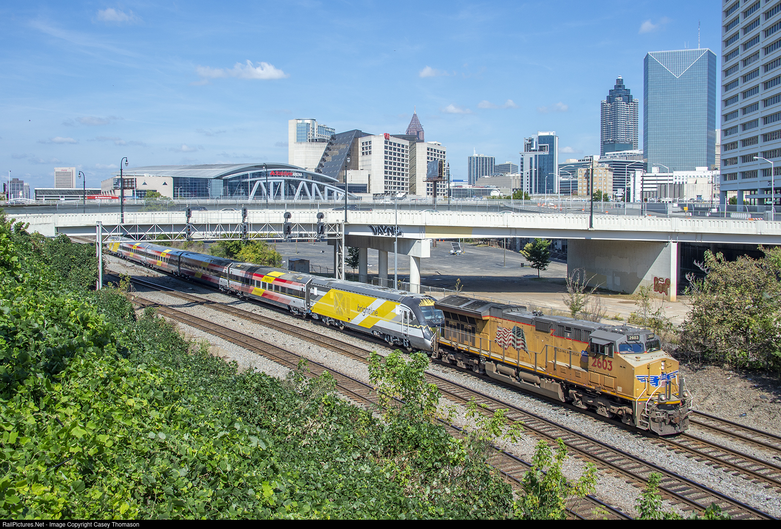 A single UP Gevo leads Florida's newest Brightline trainset through Atlanta, GA, as CSX train W98908. "Brightred" is the first of five new trainsets to be delivered to the south Florida commuter railroad. They are being built at the Siemens plant in Sacramento, California, then shipped across the country by way of Union Pacific, CSX, and FEC for delivery to Brightline at West Palm Beach.