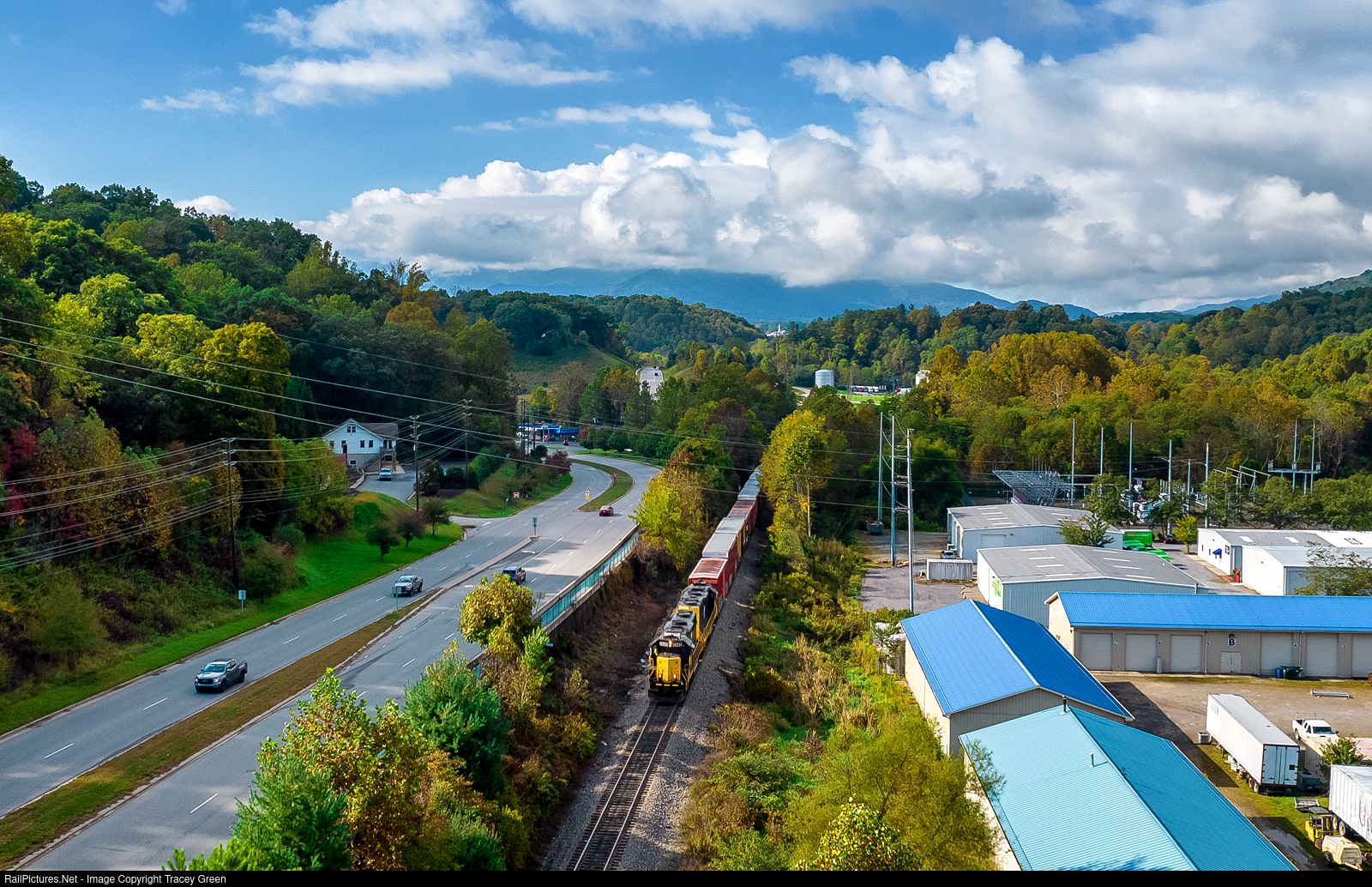Not Quite Fall. Based on the fall color projection maps, I planned a trip to Waynesville to hopefully catch the BLU locals with fall colors as a backdrop. However, the leaves haven’t quite yet changed but I was still glad to catch this shot of T59 working the Evergreen facility near Waynesville.
