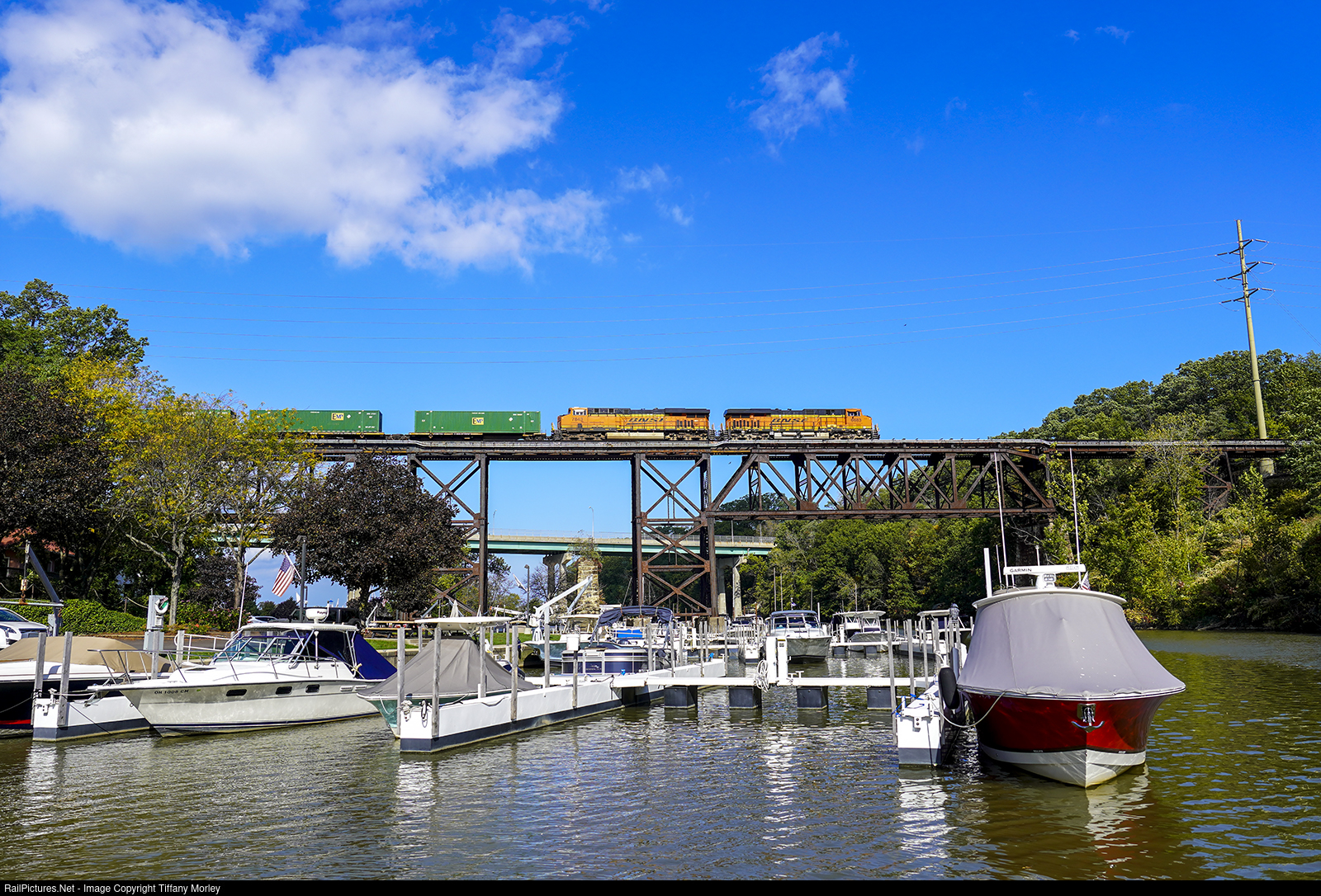 A Norfolk Southern intermodal crosses the Rocky River, West of Cleveland, on a fall morning.