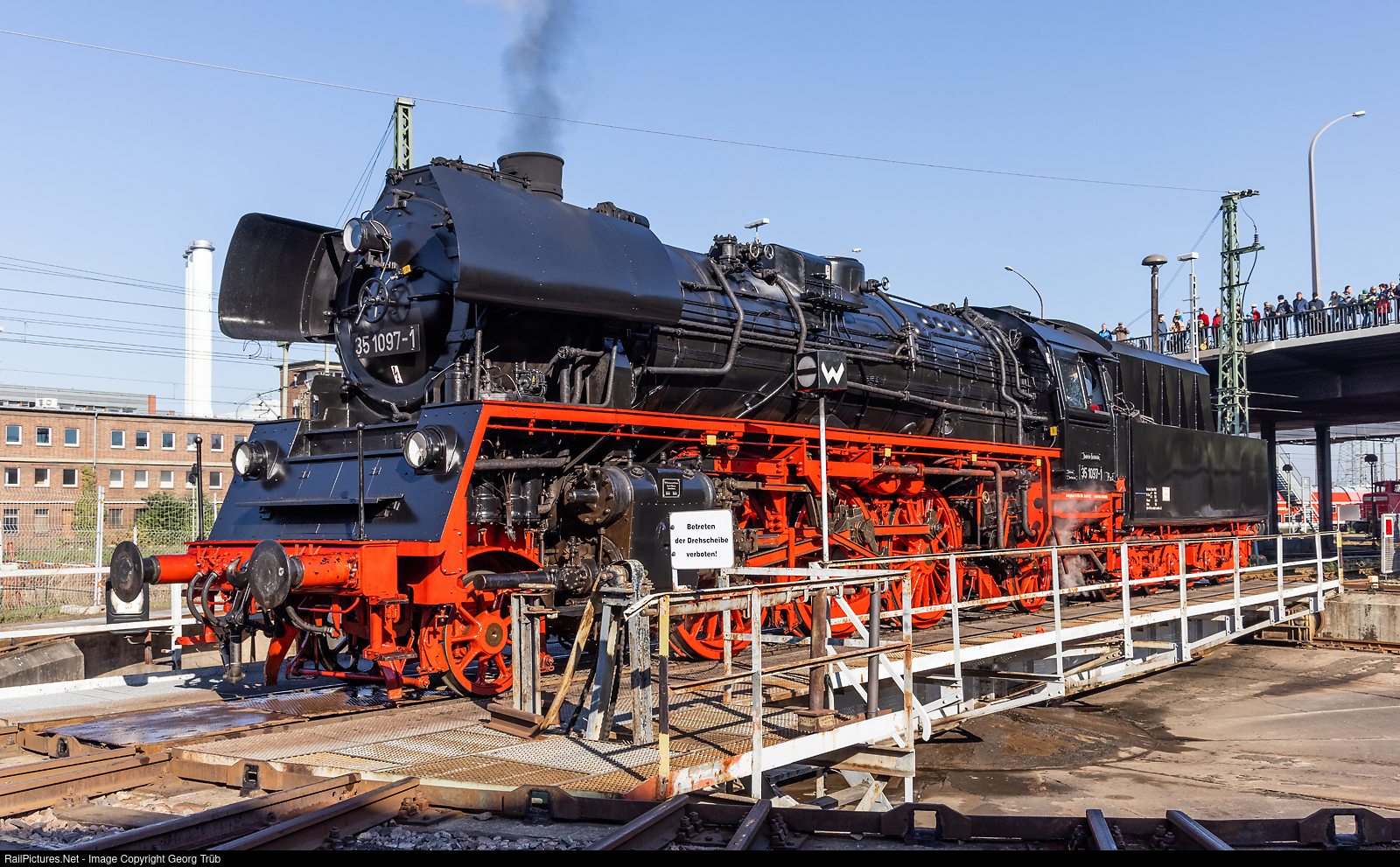 | 2-6-2 passenger train steamlocomotive 35 # 1097 of Interessengemeinschaft Traditionslok 58 3047 e. V., Glauchau, on the turntable of the Bw Dresden-Altstadt on the occasion of the 13th steamlocomotive gathering. The locomotive was built in 1959 by LKM Babelsberg for the Deutsche Reichsbahn of the German Democratic Republic (GDR) as 23 # 1097 and withdrawn in 1978. Since 1996 operational in Glauchau. |