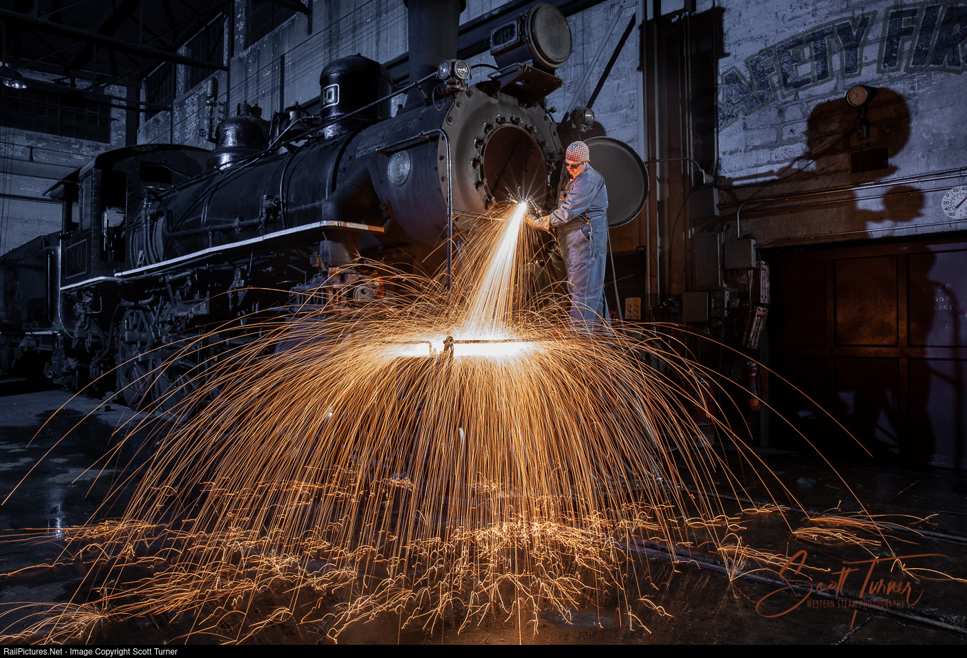 | While the Trains Magazine photoshoot was primarily about #81, we did get a chance to get a look at #40 in the shop, currently down for its FRA mandated "1472" inspection. Here we see a member of the shop crew, wielding a cutting torch at work on #40's smokebox door. Scene and lighting courtesy of Steve Crise. |
