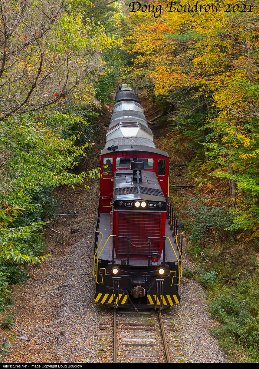 | The Plymouth & Lincoln fall foliage train is seen snaking its way through rural New Hampton, NH approaching Ashland on old Boston & Maine trackage amid some peak foliage. The SW1000 was built in 1970 for Burlington Northern. |