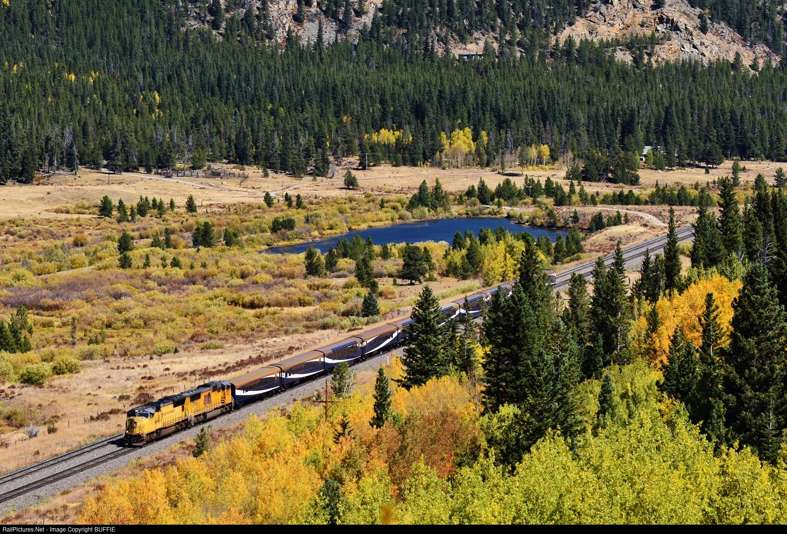 | The Rocky Mountaineer train is being led by UP 5107 (SD70M) as it passes through Tolland, Colorado with the aspen in full color-change mode. It appears the train will run again next year (Denver to Moab, Utah) and it sounds like they will be able to run two GP40 type engines which hopefully will be color matched to the passenger cars. |