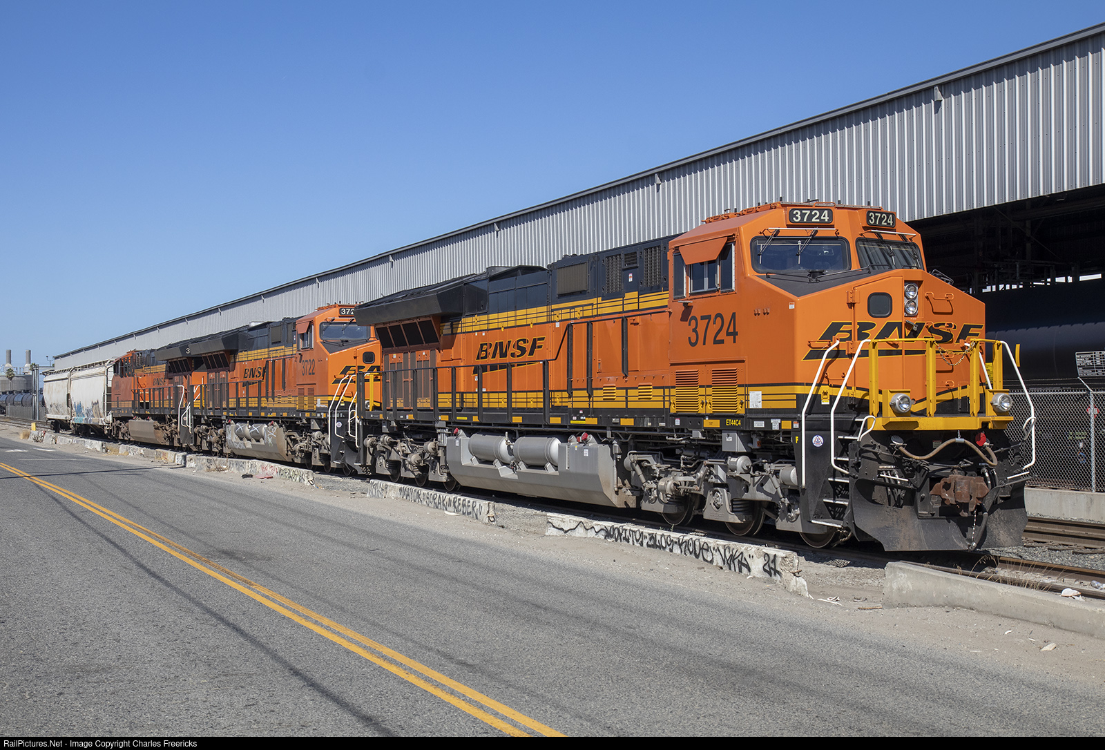 | A BNSF power awaits its next assignment on the tie up track with half the engines sitting in Wilmington California and half in Carson California as they are parked on the border. |