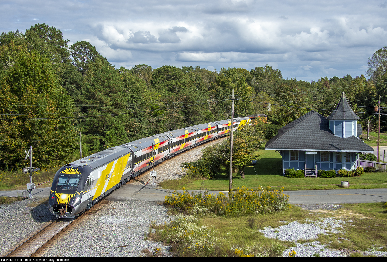 The first of five new trainsets to be delivered to the south Florida commuter railroad Brightline is "Brightred", seen here passing the old Atlantic Coast Line depot in Ideal, Georgia. The sets are being built at the Siemens plant in Sacramento, California, then shipped across the country by way of Union Pacific, CSX, and FEC for delivery to Brightline at West Palm Beach.