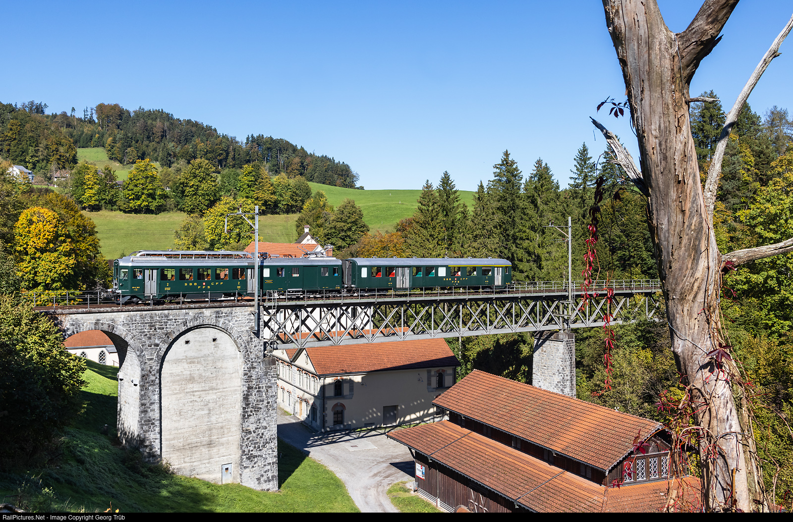 | Railcar with baggage and passenger compartment BFe 4/4 # 1643 (built 1955 by SLM/BBC/MFO/SIG) with cab car ABt # 1715 of SBB Historic, based in Winterthur, is running train 31150 from Bauma to Hinwil on the DVZO line, crossing the Weissenbach bridge/Neuthal viaduct. Such vehicles were regularly running on this line in the 1950'/1960' till the service was suspended on this section of the former Uerikon-Bauma-Bahn on may 31th, 1969. |
