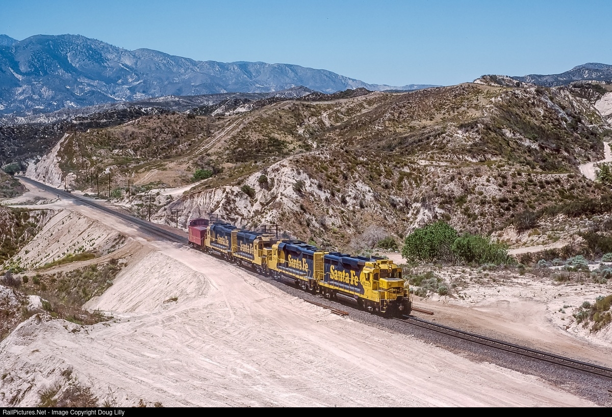 Four Santa Fe GP30’s bring a caboose hop up the storied grade at Cajon, California. I’m not sure of the assignment, but it was neat to see.