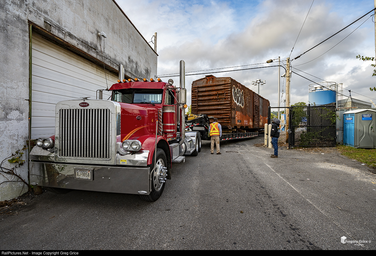 Pedowitz Machinery Movers crews made several attempts to squeeze vintage boxcar "SHOP 100" through the Long Island Rail Road's narrow Oyster Bay Yard employee exit on the morning of October 9th, 2021. On this attempt, the rear of the trailer was skated and the tractor was placed as close to the wall of the adjacent building as possible allowing the boxcar to finally clear a small pole that was in the way. The boxcar was on it's way from Holban Yard in Queens, NY to its new home at the Oyster Bay Railroad Museum where it will sit on display for all to see.