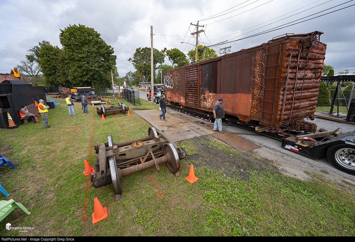 On the morning of October 9th, 2021, vintage boxcar "SHOP 100" has just arrived at the unloading spot next to its new home at the Oyster Bay Railroad Museum. From here, it will be picked up and placed back onto it's trucks which can be seen already in place in the display yard.