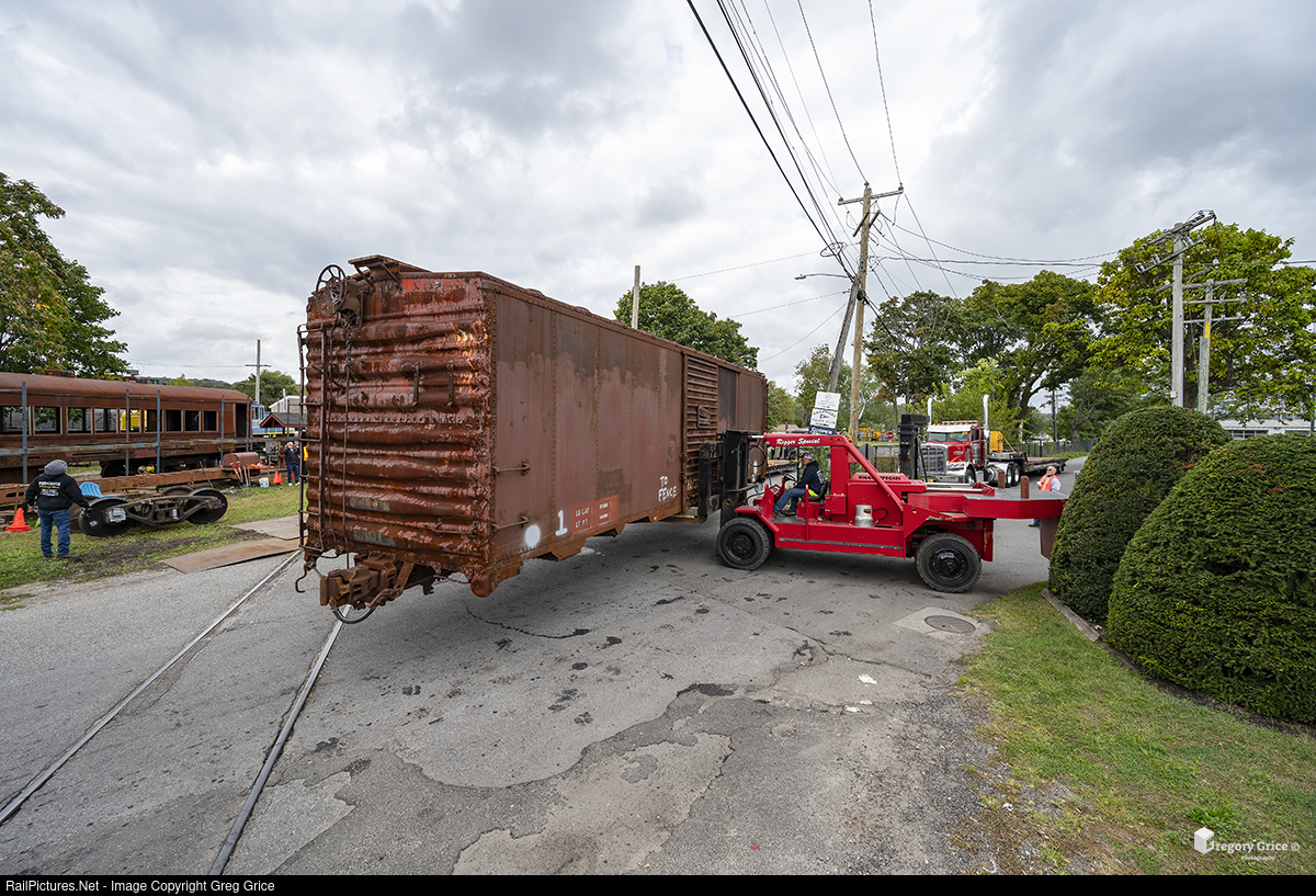 On the morning of October 9th, 2021, vintage boxcar "SHOP 100" was unloaded at its new home at the Oyster Bay Railroad Museum. In this frame, the boxcar has just been lifted by the Riggers Special forklift and the trailer which carried it from the yard is in the process of being moved out of the way. From here, it will be picked up and placed back onto it's trucks which are already in place in the display yard.