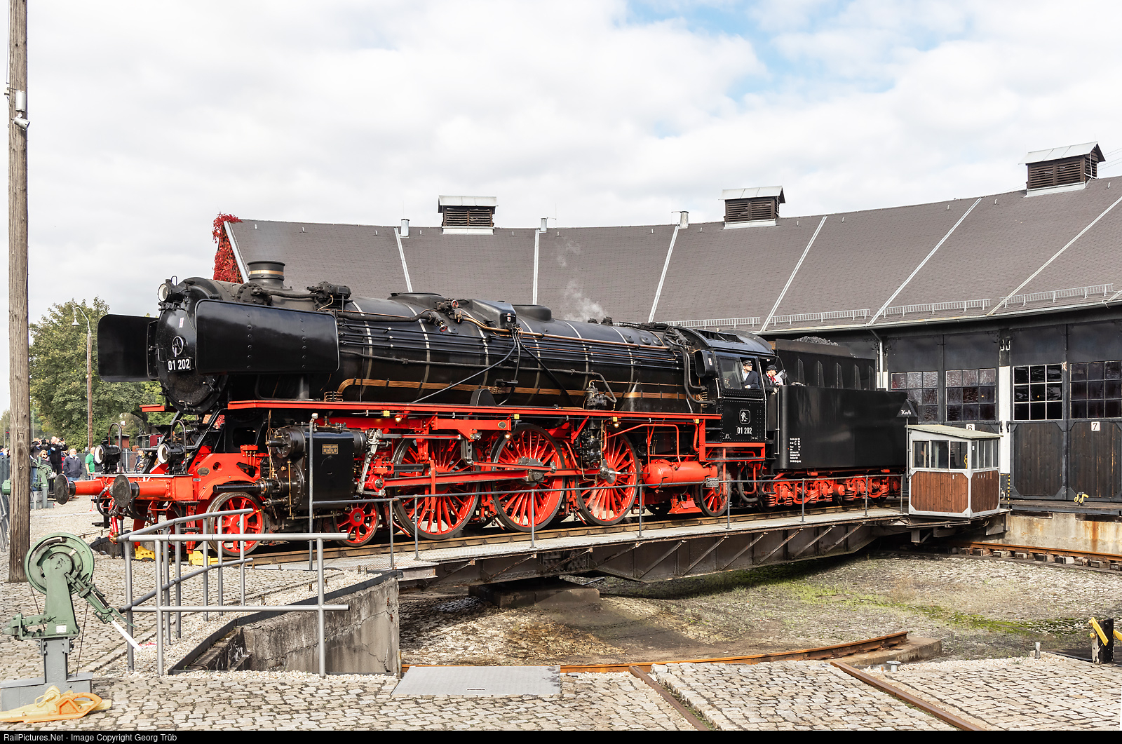 | The express train steamlocomotive 01 # 202 of the association "Pacific 01 202" in Lyss/Switzerland is on the two days trip to the 13th steamlocomotive gathering in Dresden and reached Neuenmarkt-Wirsberg shortly. Here the 4-6-2 is being turned on the segment turntable of the Deutsches Dampflokomotiv Museum (DDM) in Neuenmarkt-Wirsberg for the further journey up over the "Schiefe Ebene". |