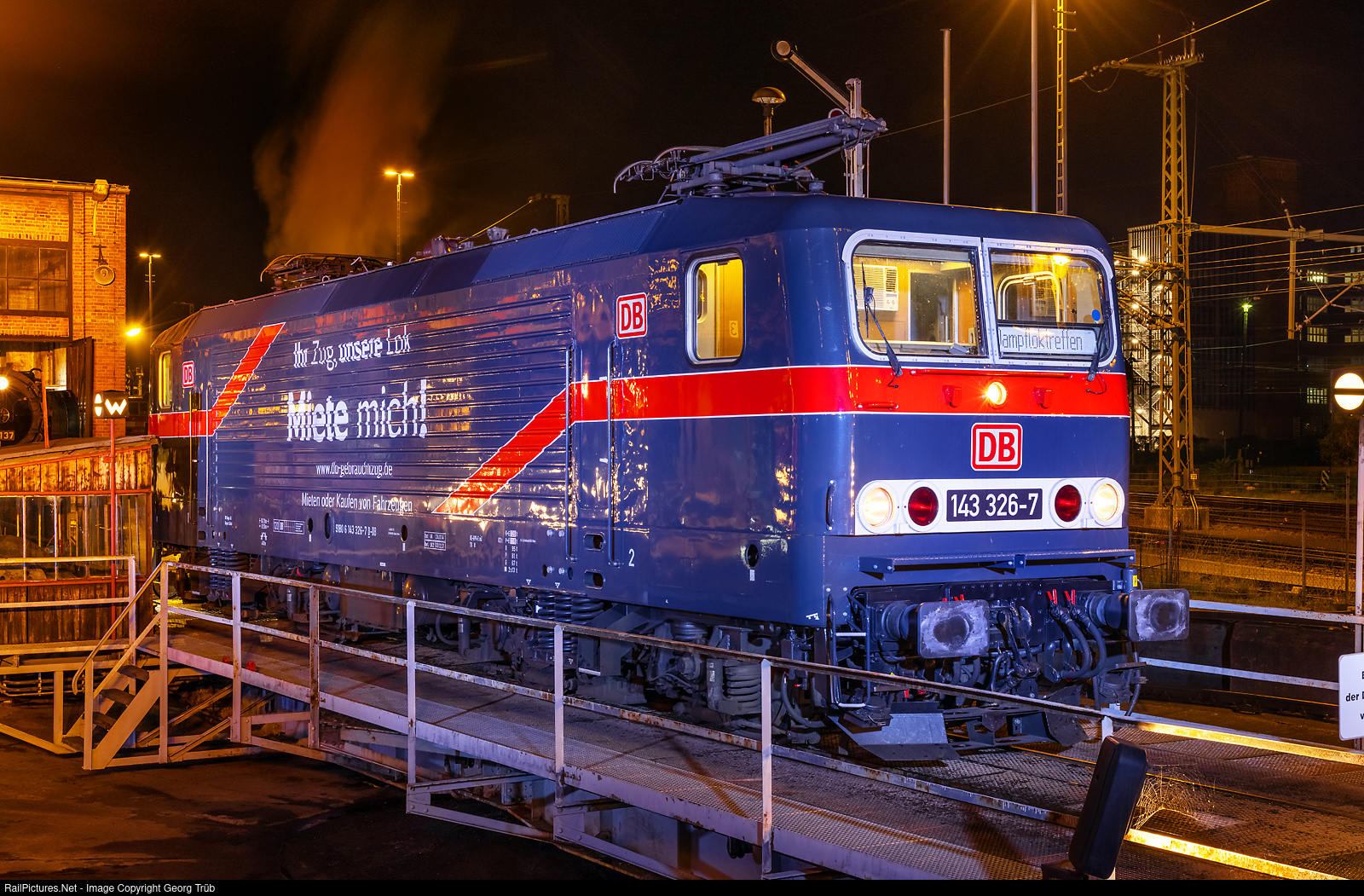 | Electrolocomotive 143 # 326 of Deutsche Bahn (Gebrauchtzugportal der DB Regio AG, Regio Südost, Halle) in the publicity paint scheme "Ihr Zug - unsere Lok. Miete mich!" on the turntable of the Bw Dresden Altstadt on the occasion of the night photo event during the 13th steamlocomotive gathering. The locomotive was built by LEW in 1988 for the Deutsche Reichsbahn (DR) of the German Democratic Republic (GDR) as 243 # 326-6. In this paint scheme since december 2020. |
