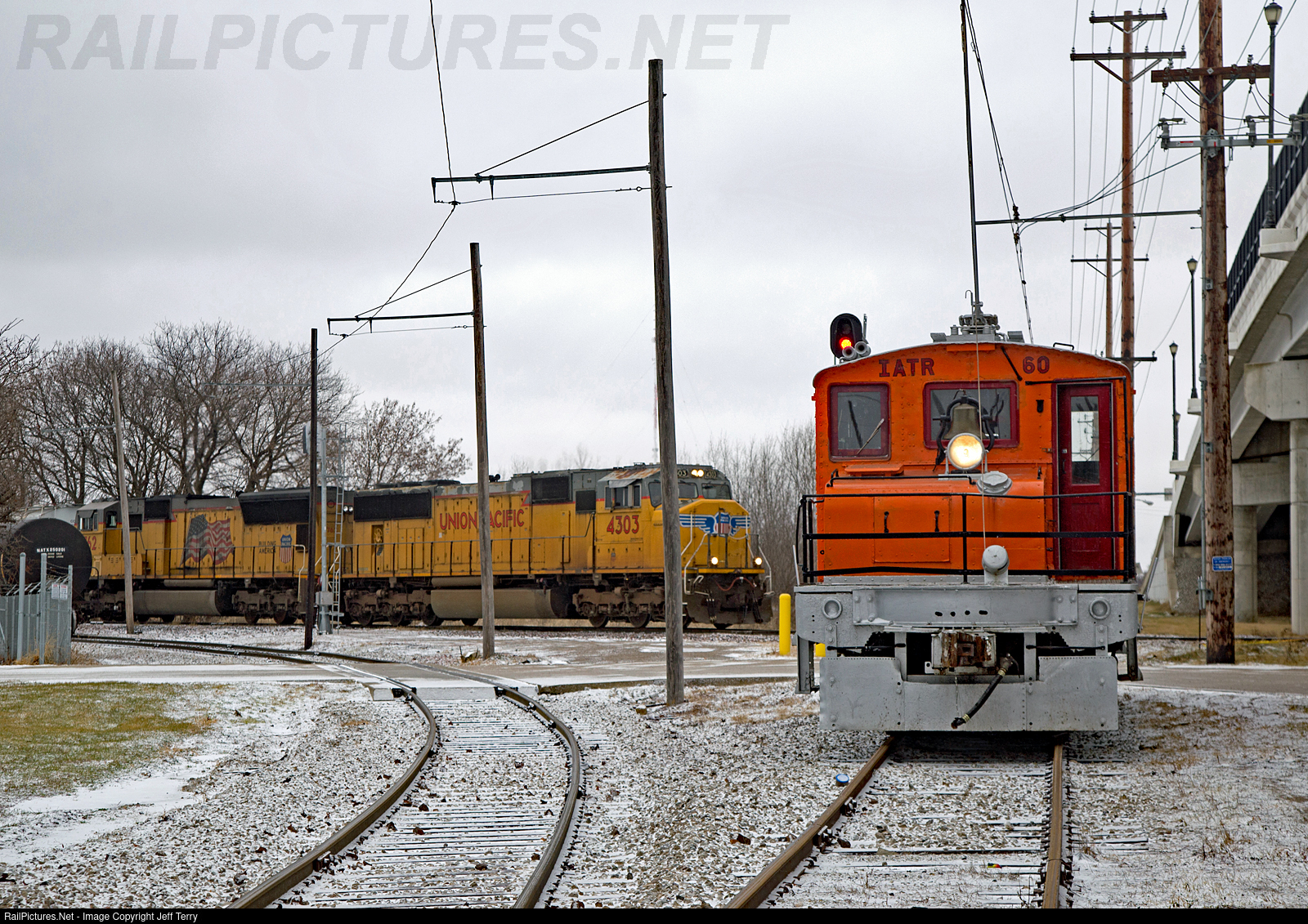 IATR 60 waits at Clear Lake Junction while a UP freight passes over the diamond. Union Pacific SD70M No. 4303 was built 84 years after No. 60, which came out of Baldwin in 1917. The Iowa Traction Railway, running between Clear Lake and Mason City, Iowa, is the last electrically-operated interurban common carrier in the United States.