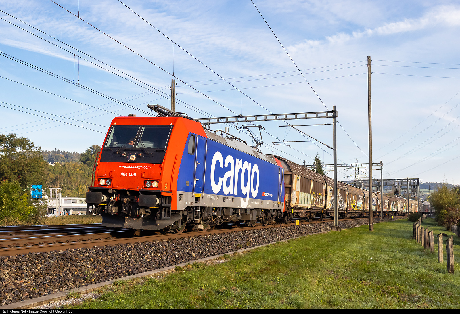 | Bombardier TRAXX F140 MS Re 484 # 006 of the SBB, now running for SBB Cargo instead of SBB Cargo International, is pulling the fast freight train 63120 from Gossau SG to the Limmattal shunting yard (RBL) via Winterthur-Kloten-Regensdorf-Würenlos-Killwangen, through Winterthur Tössmühle at 120 km/h. |