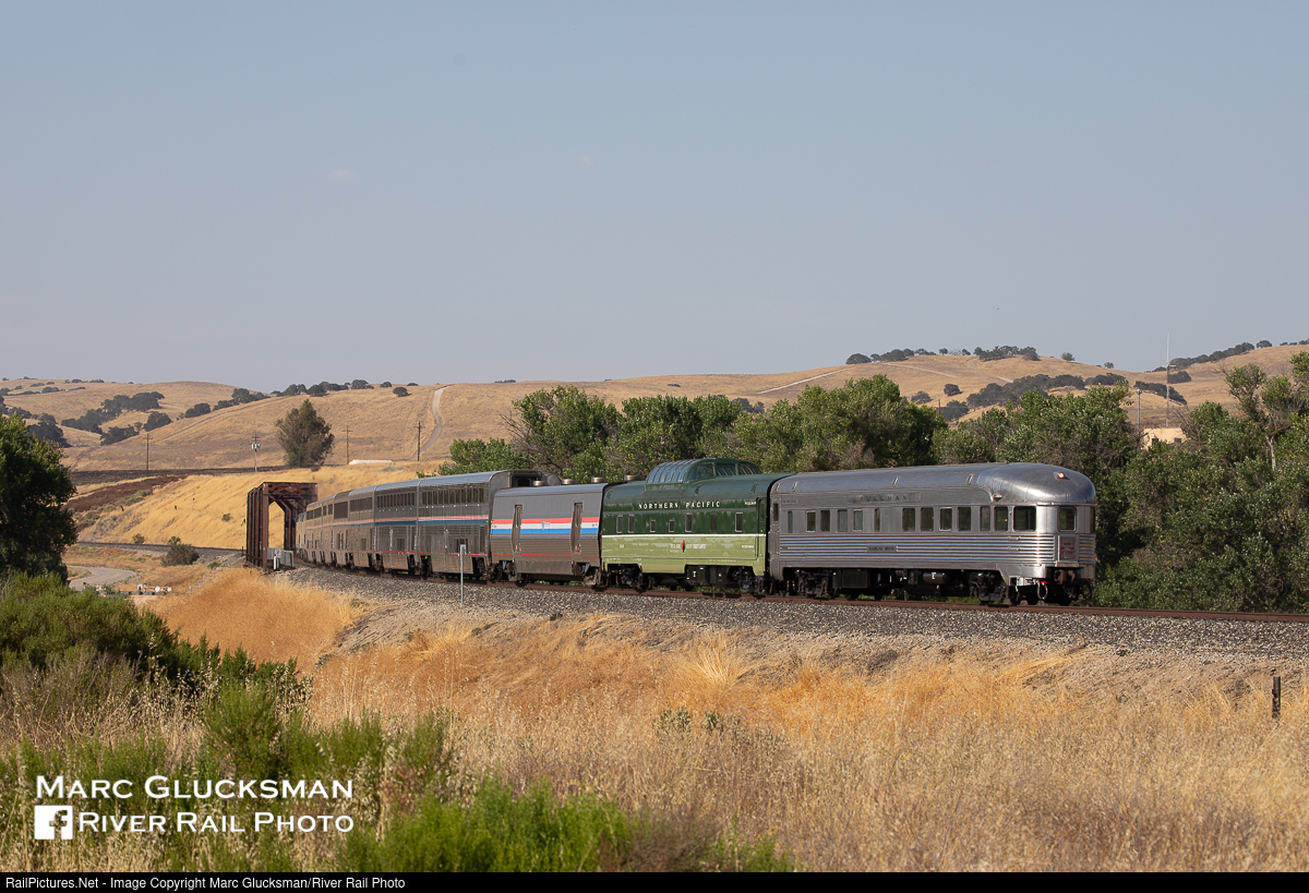 | Where Were You Born? Webb Rail's former New York Central Railroad Budd built Pullman obs/diner/sleeper "Babbling Brook" (WEBX 800007) and former Northern Pacific Railway Budd built Pullman dome/sleeper 313 (WEBX 801044) held the markers on the Amtrak Coast Starlight (Train 14) on July 25, 2020. The train is approaching the Salinas River, Nacimiento, California on a scorching hot afternoon. |