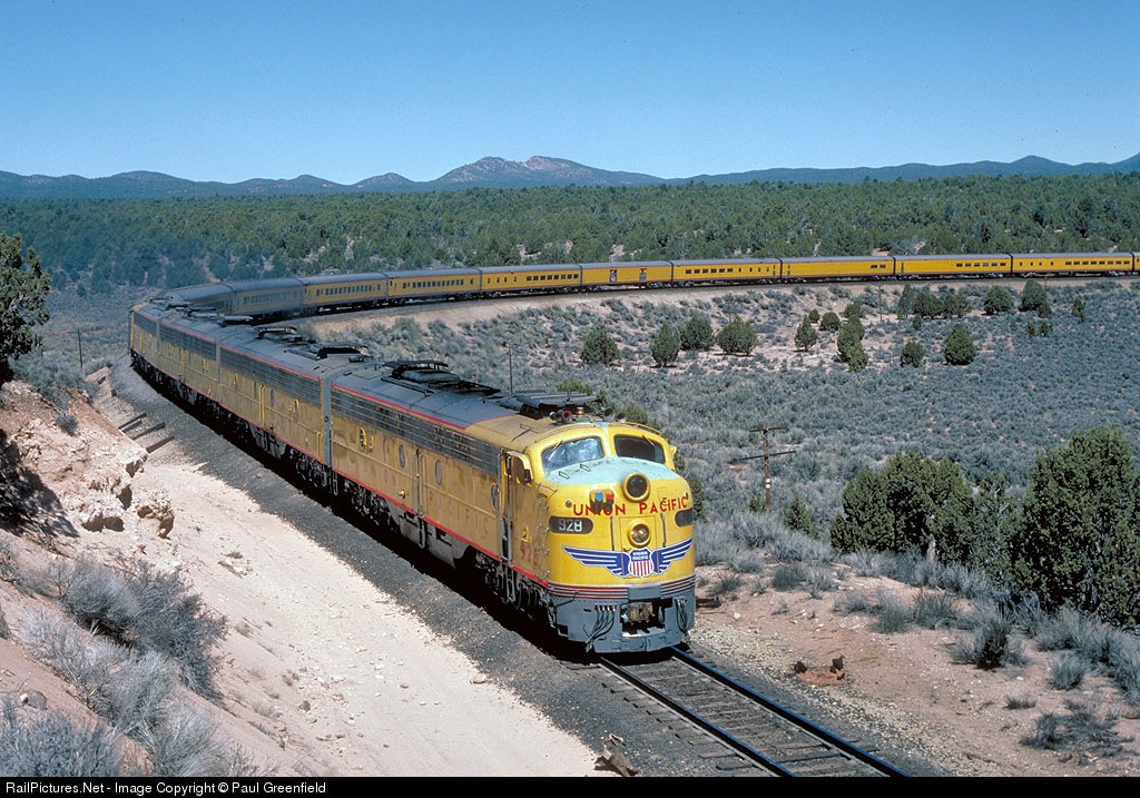See beautiful diesel locomotives in UP's traditional armour yellow livery and special commemorative paint schemes pulling long trains of yellows cars reminiscent of the days when UP domeliners seemed to go Everywhere West.