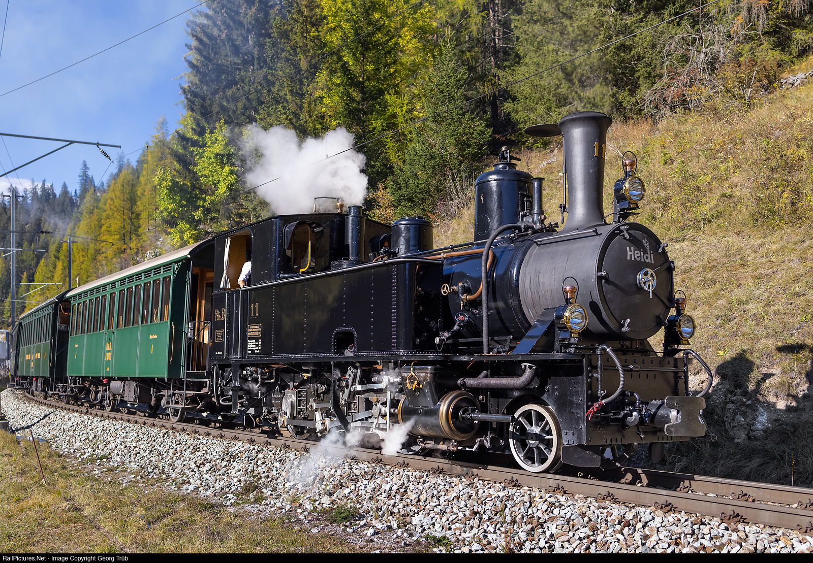 | Lightoil fired 2-6-0 T steamlocomotive G 3/4 # 11 "Heidi" of the Rhaetian Railway, built in 1902 by the SLM Winterthur, on a photo runby near Bergün on the occasion of the "Albula Steam Excursion" from Samedan to Surava and back. |