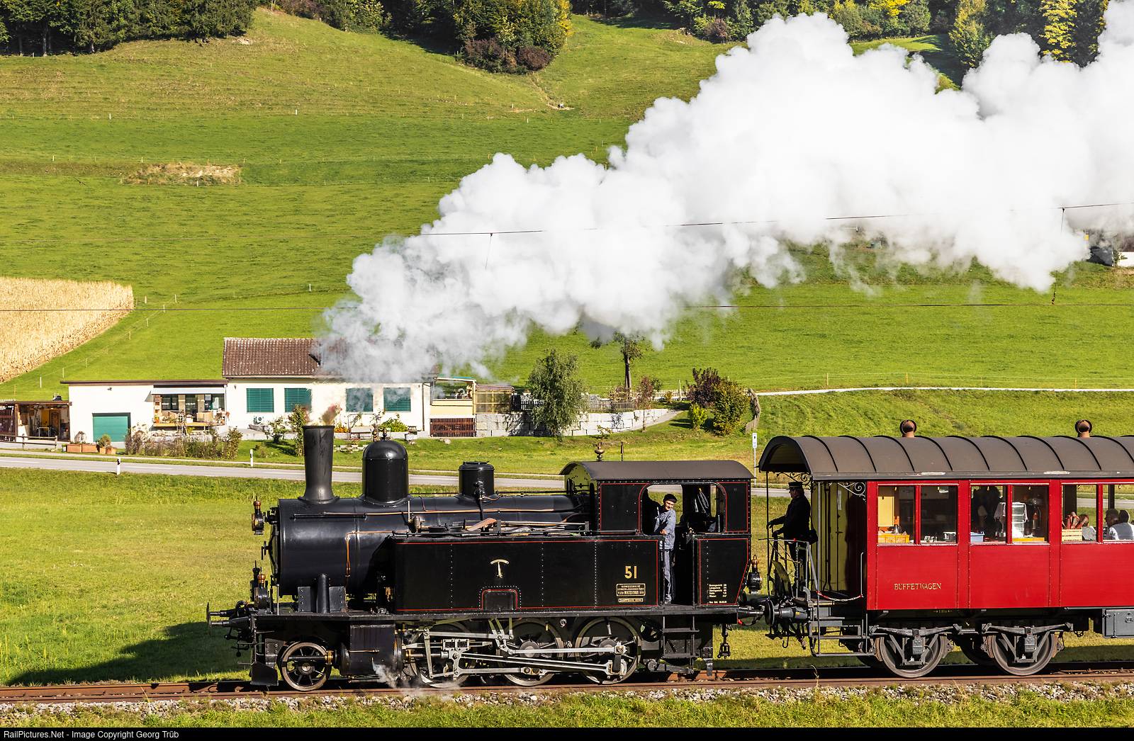 | 2-6-0 T Ed 3/4 # 51 of the Dampfbahn Bern (DBB), built in 1906 by SLM for the Bern-Schwarzenburg-Bahn (BSB), is pulling train 31159 from Hinwil to Bauma, between Bäretswil and Neuthal on the line of the Dampfbahnverein Zürcher Oberland. The locomotive is guest for 4 days on the occasion of the "Zeitreise" timetable with electro and steam trains. |