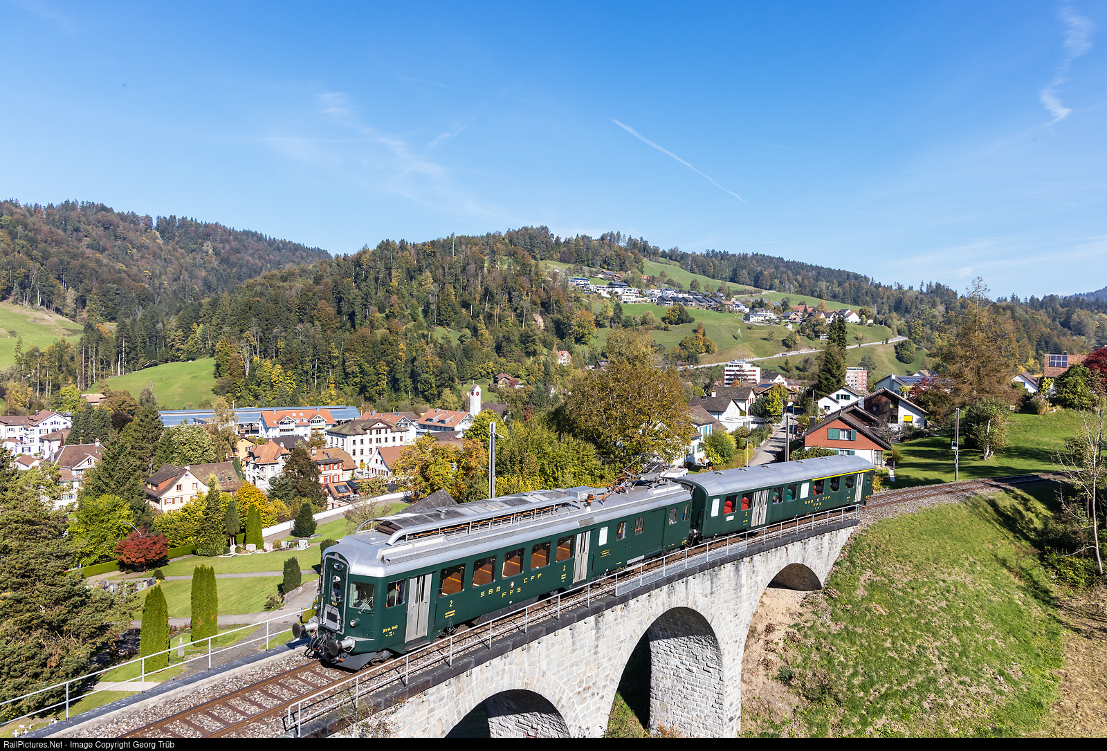 | Baggage/second class railcar BFe 4/4 # 1643 with cab car ABt # 1715 of SBB Historic, based in Winterthur, is crossing the Böhl viaduct between Neuthal and Bauma, running train 31153 from Hinwil to Bauma on the occasion of the "Zeitreise" timetable with electro and steam trains on 4 days of the week in october 2021. |