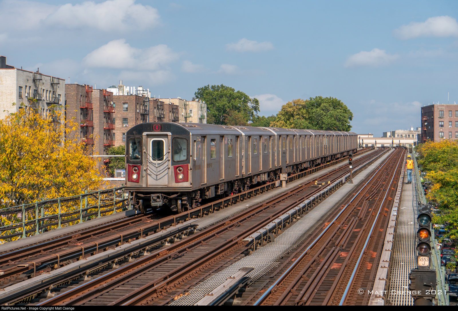 A Manhattan-bound 4 train is seen north of Mosholu Pkwy Station on the IRT Jerome Avenue Line. The leaves are just starting to turn in NYC, with the species of tree at left turning bright yellow very early on.