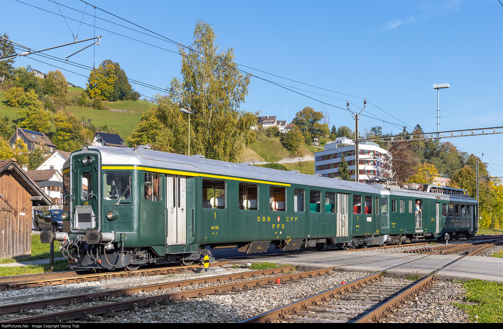 | Push-pull train for regional lines of the 1950'/1960' is entering Bauma as last train of the day from Hinwil. Leading is cab car ABt # 1715 with first and second class compartments and shoving railcar BFe 4/4 # 1643 with baggage and second class compartment. The train also called "Wyländerli" of SBB Historic is based in Winterthur. |