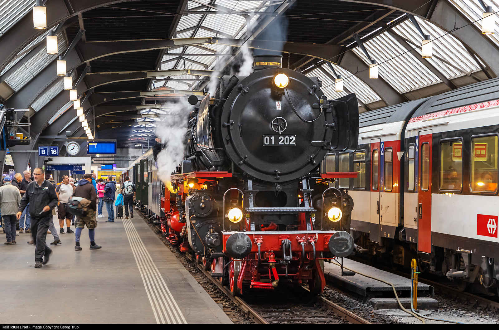| Zürich main station track 16 at 08.05 AM: The steamtrain 5320 of ZRT Reisen with steamlocomotive 01 # 202 of the association "Pacific 01 202" from Lyss and the blue former Deutsche Bundesbahn express train cars of the "Suisse Train Bleu" (including an ABm rented from NeSA/Eisenbahnfreunde Zollernbahn) is ready for departure to the 13th steamlocomotive gathering in Dresden/Germany. The journey went via Bülach-Schaffhausen-Radolfzell-Friedrichshafen-Ulm-Aalen-Crailsheim to Nürnberg on this day, and on the following day via Hersbruck-Bayreuth-Neuenmarkt-Wirsberg-Hof-Chemnitz to Dresden. |