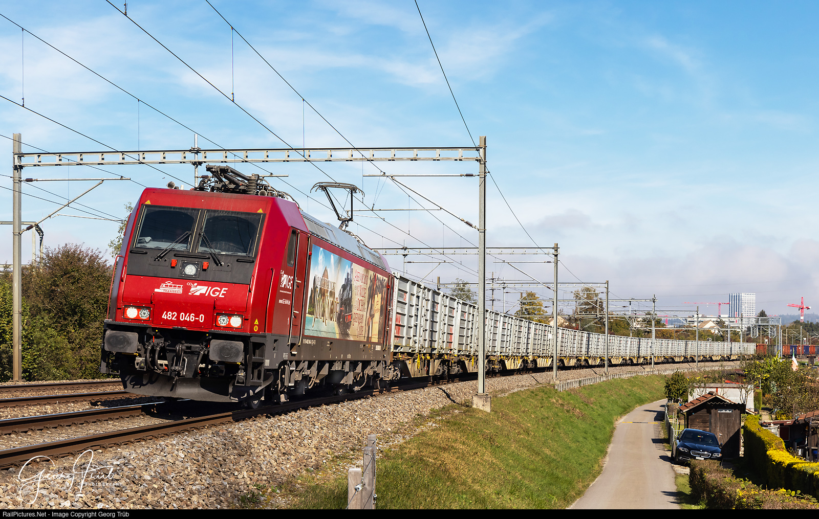 | Re 482 # 046 of the International Rolling Stock Investment Gmbh (IRSI) in the "Jim Knopf" paint scheme is pulling the about 600 meter long empty sugar beet train 48086 from Islikon via Winterthur-Kloten-Regensdorf-Bözberg-Basel RB to Wismar/Germany, between Winterthur and Winterthur Tössmühle. The train had Sgns container cars with "ForstLogistik" containers and Eaos cars of Axbenet and VTG as well. |