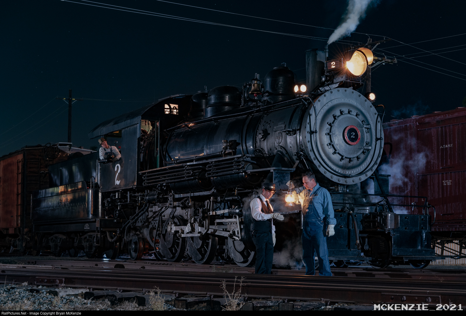 Ventura County Railway locomotive #2 simulates a night in Oxnard yard with some vintage wooden boxcars under a full moon. This photo was from last Saturday's night time photo shoot featuring the VC2 before its 1472 rebuild.