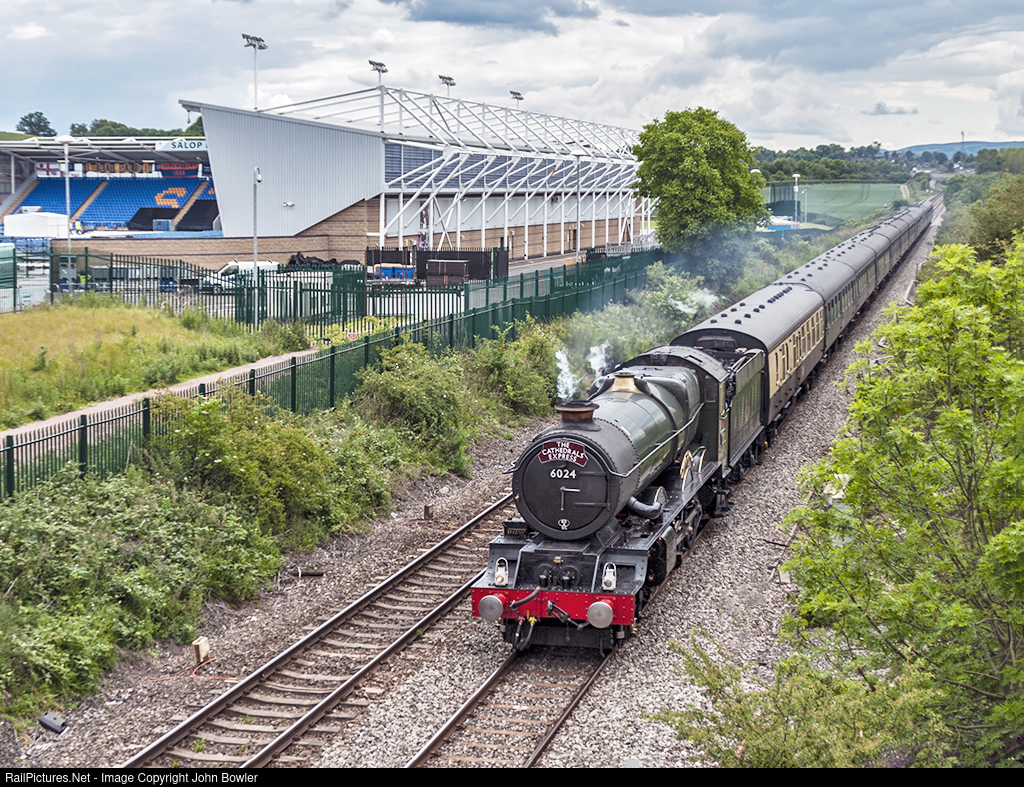 | GWR 6024 'King Edward I' passes Shrewsbury Town Football Club's Greenhous Meadow Stadium (now called the Montgomery Waters Meadow Stadium) with the 1Z92 'Cathedrals Express' 0804 London Paddington - Shrewsbury |