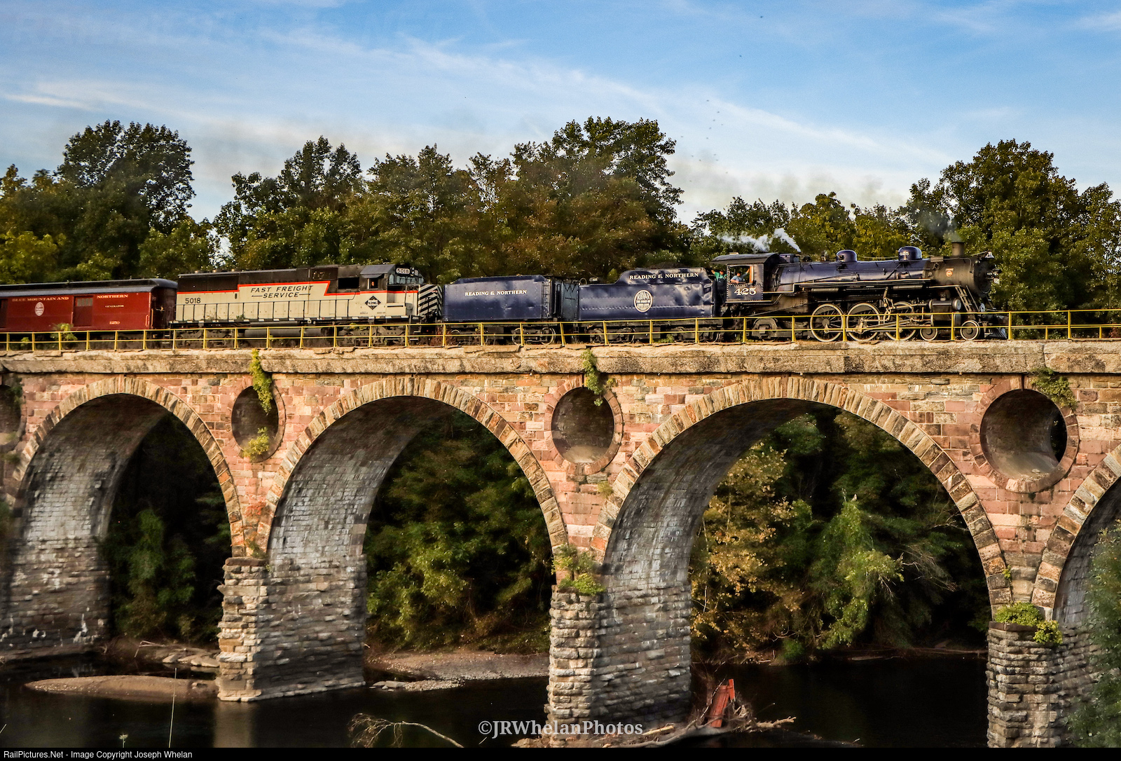 | As a long day comes to a close, Reading & Northern 425 rolls over the famed stone arches of the Peacock's Lock Viaduct. An 1856-built stone arch viaduct and the only viaduct in the United States constructed with pierced spandrels. |