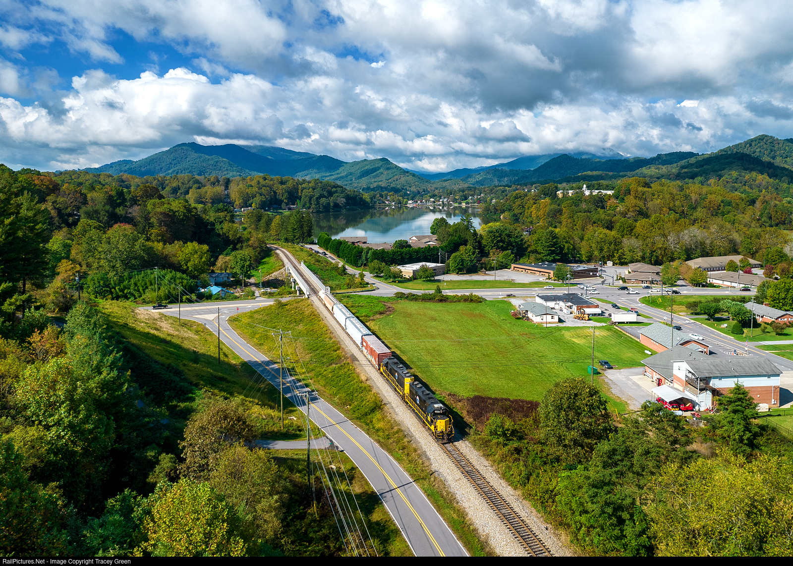 | Returning to the Yard. With a beautiful mountain backdrop, T59 passes Lake Junuluska on its way back to the BLU yard in Canton, NC. It has just finished working the Evergreen facility near Waynesville. |
