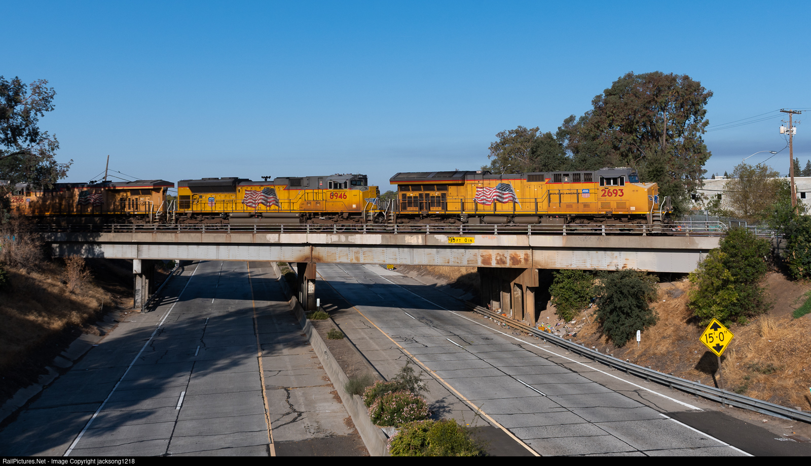 A northbound manifest train has just come off the Fresno Sub at Elvas and is now on the Martinez Sub as it passes over California Highway 160.
