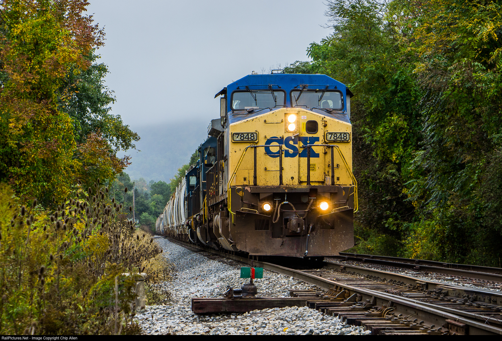 After climbing up the mountain from Hagerstown, CSX B702 cuts away from its Maryland Midland interchange traffic before continuing to the grit mill in Charmain, PA. Older power tends to hang around this former Western Maryland territory, as evidenced by the Dash 8, SD40-2, and GP38-2 out front.