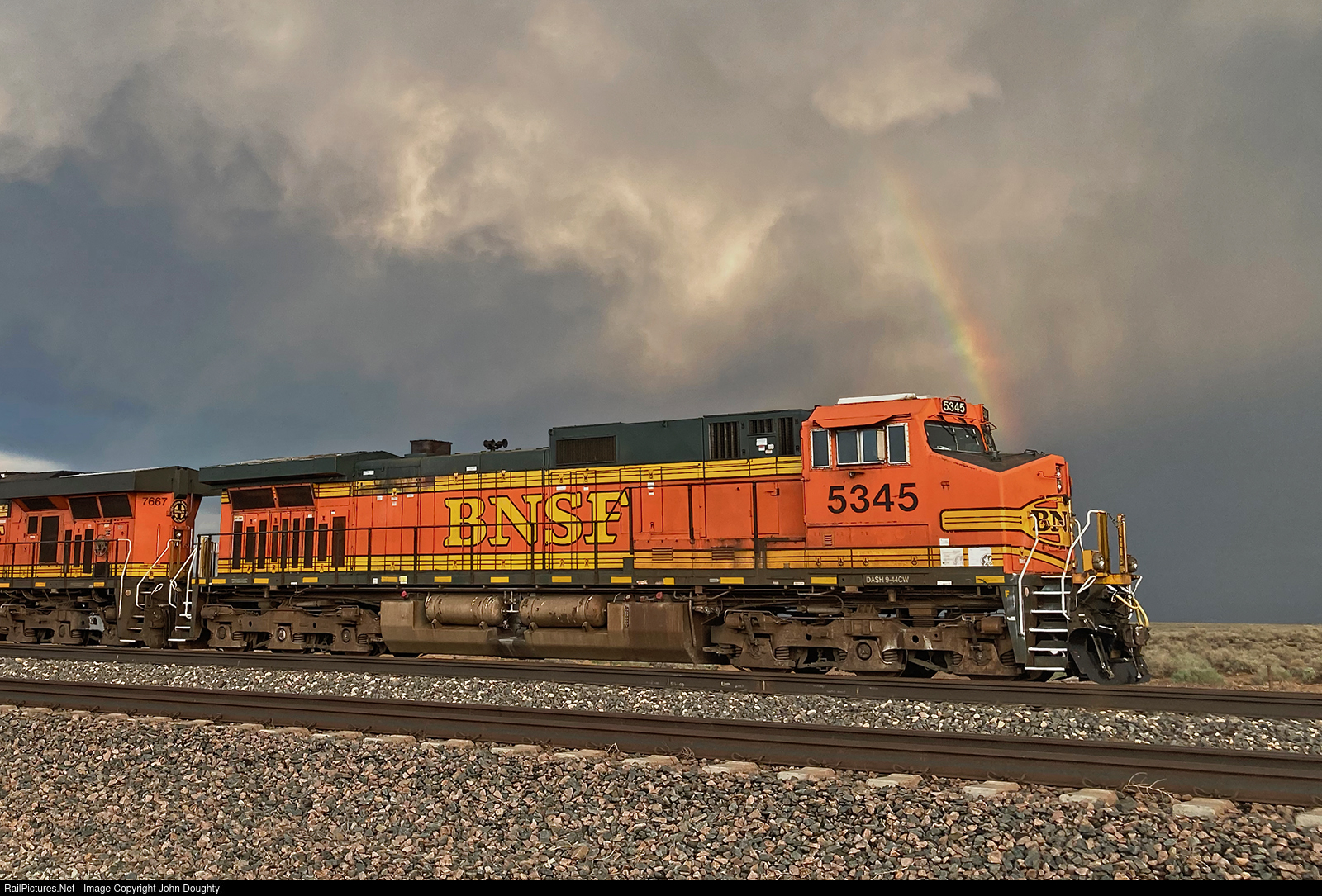 | As a severe thunderstorm slowly drifts south and away from the Dalies area, a rainbow appears over the BNSF 5345. A strong wind warning extending 90 miles west from Belen caused the dispatcher to hold multiple westbound trains at the summit until the storm cleared the area. BNSF 5345 waits for its turn to head west. |