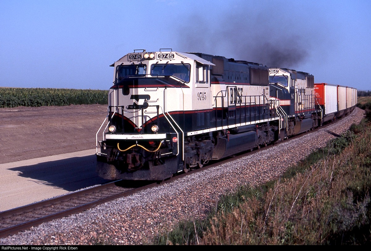 BNSF 9745 leads empty hoppers west between Anselmo and Lin Scott, NE. The second unit, 9647, is the infamous and much maligned BNSF experimental scheme that was an attempt to combine the executive colors of BNs SD70 MACs with a Santa Fe style logo. It wasn't well received. Grading for an additional track is evident here. The location is close to the point where cornfield Nebraska succumbs to cow country. Fuji Provia.