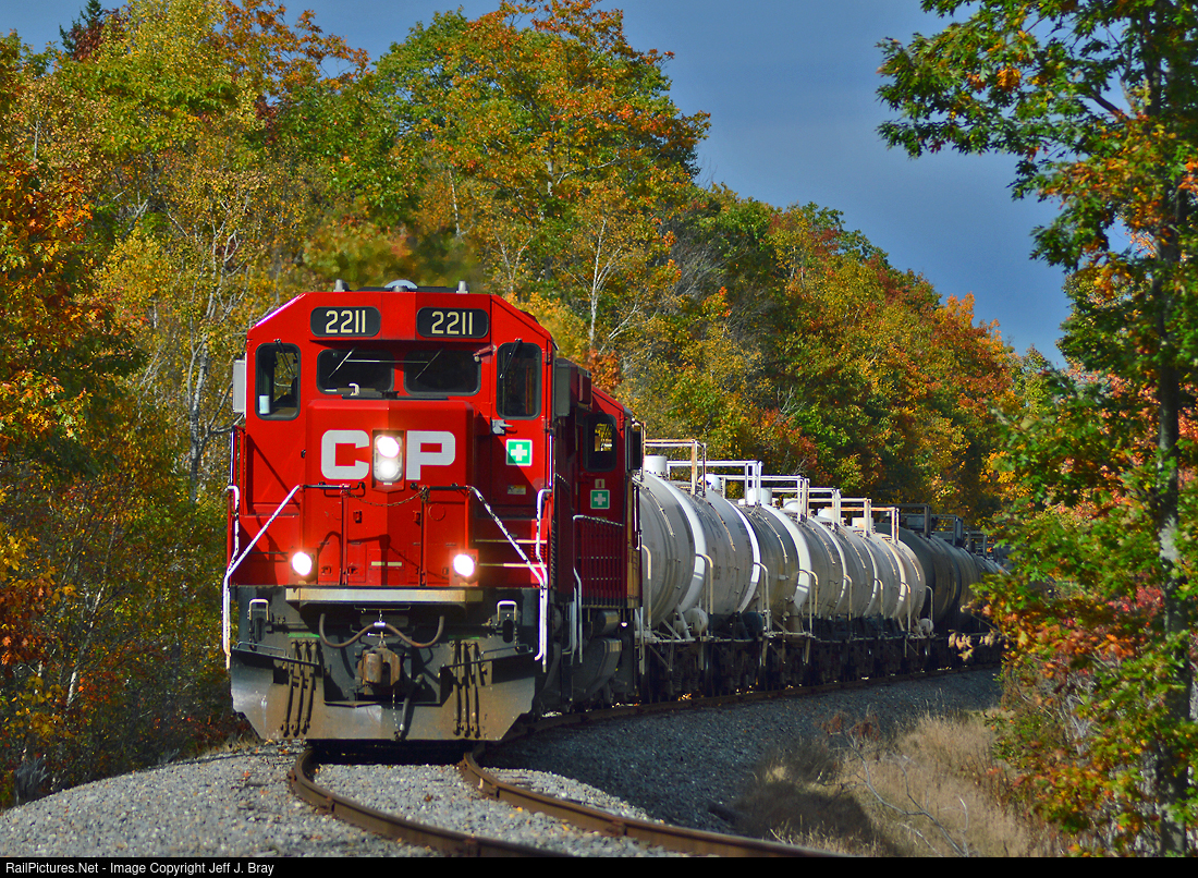 With showers building fast to the North, Canadian Pacific's F13 was staying a step ahead on October 18, 2021. Making its twice-weekly run out of Hermon, Maine, the train had reached MP14 and the base of Mosquito Mountain in Frankfort about ten minutes ahead of the rain. Even this far into foliage time, nearby oaks were showing their stuff alongside the two colorful GP20ECOs that were leading their short train to Searsport. It's cool to think that tidewater marshes are about 1000ft to the right while the granite face of 570ft Mosquito Mountain is less than that distance to the left!