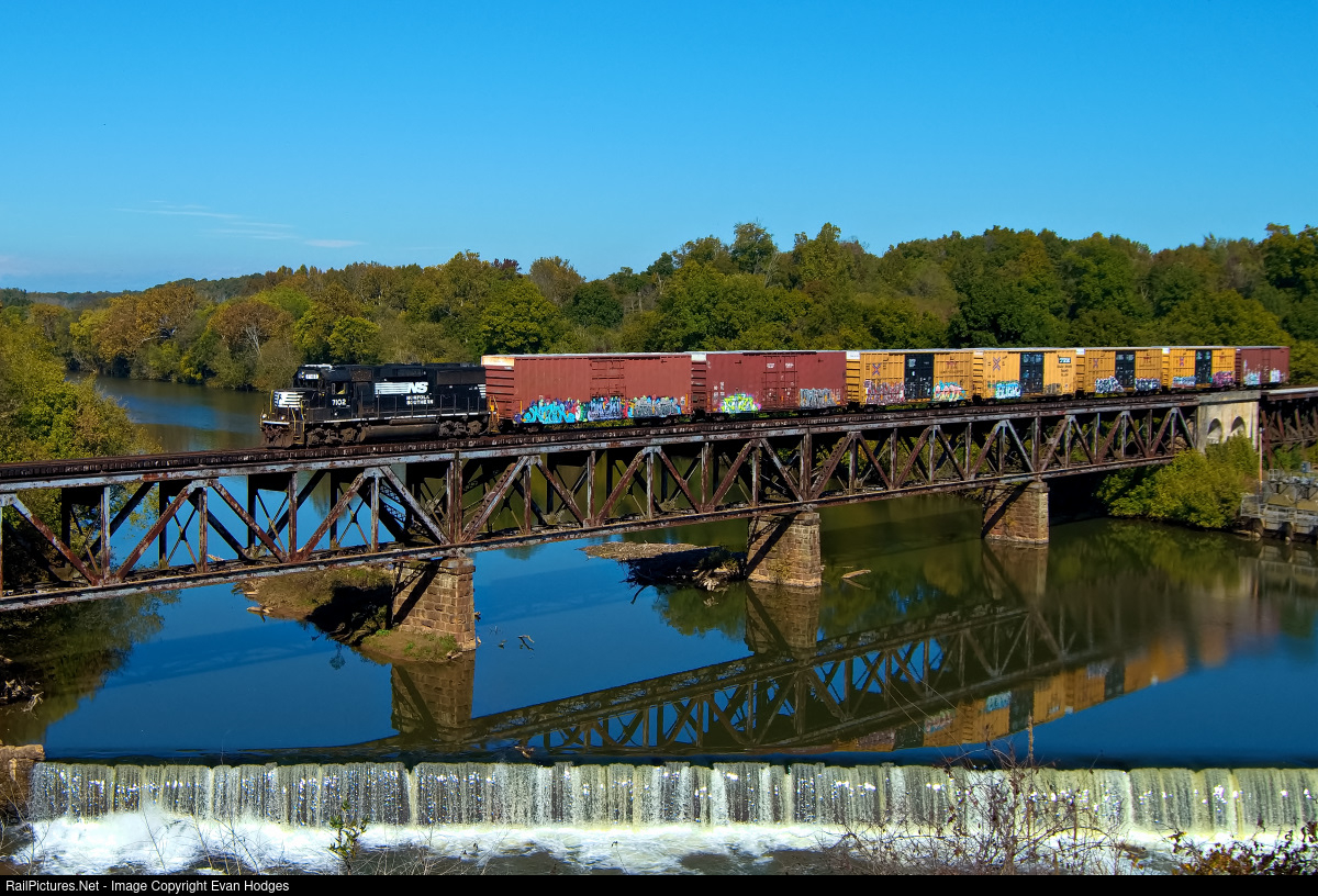 An old NS GP60 crosses over the Yadkin River between the Forsyth and Davie county line sporting the old NS logo with empty boxcars from the Triangle Warehouse in Clemmons.