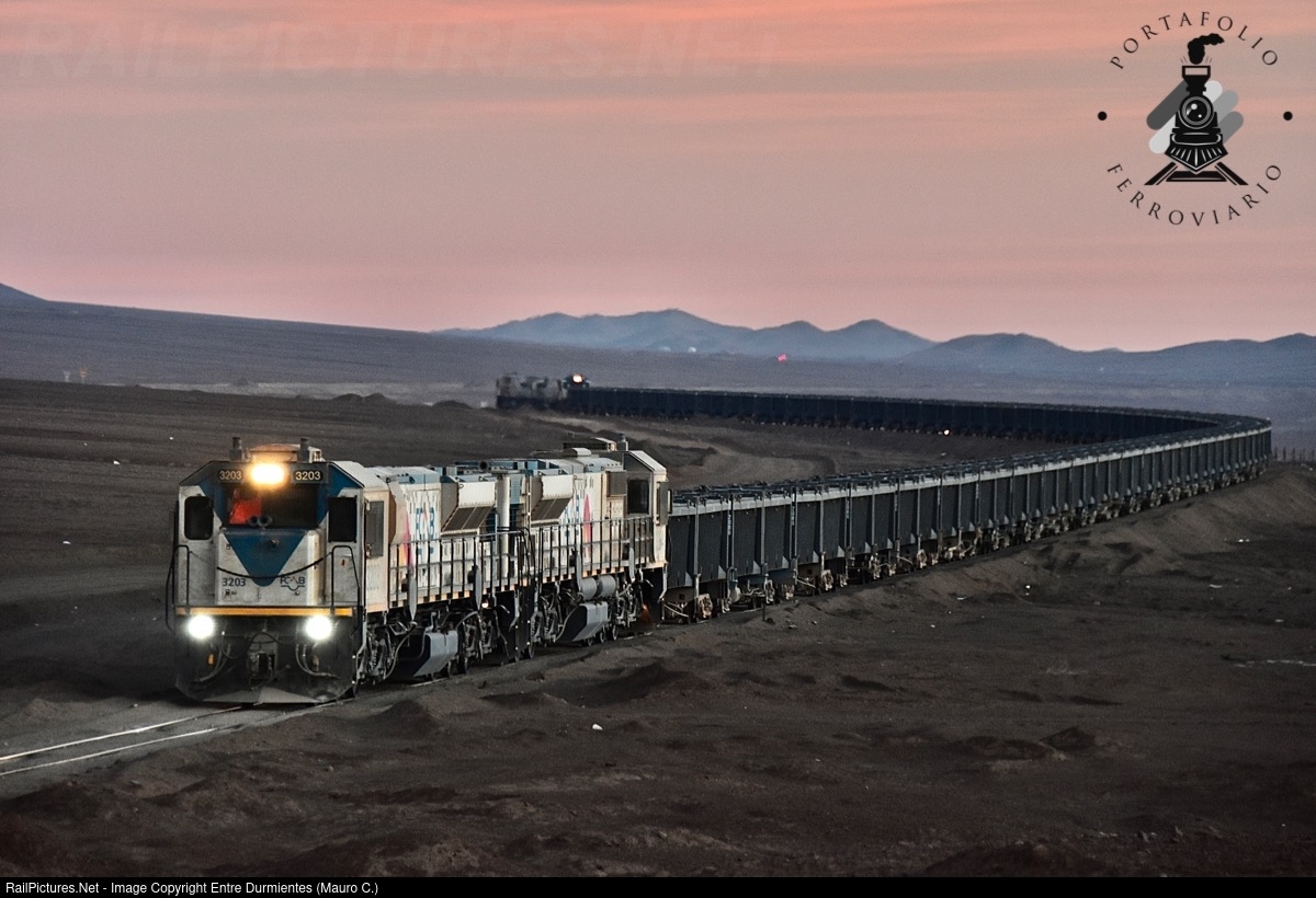 One of the longest and heaviest FCAB trains in Chile, the 1212 train that comes from the SPENCE large copper mine located between Sierra Gorda and Calama and that transports copper concentrate in rotainer containers, runs through the tough Cumbre pass on its way to the port Angamos in Mejillones, needing the work of pusher locomotives in the tail of the train to be able to reach the top of the pass, and then the same 4 EMD GT42AC locomotives are necessary for the braking and controlled advance of this train. The Cumbre Pass is a by pass line (that avoids going through Antofagasta city) and connection between large copper mining (Chuquicamata, Codelco Calama, Radomiro Tomic, Spence BHP, Sierra Gorda SCM, others) and port of Mejillones, in the Atacama desert, second region of Chile. The line is characterized by the difficulty of their route, it must reach a great height in a few kilometers for which the train travels through multiple curves and steep inclines of ascent and descent.