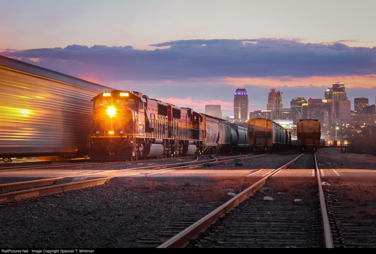 A KCS transfer holds just outside of Knoche yard with a pair of Maces on the point while a yard transfer rolls past and the final light of day glows around the city Skyline.