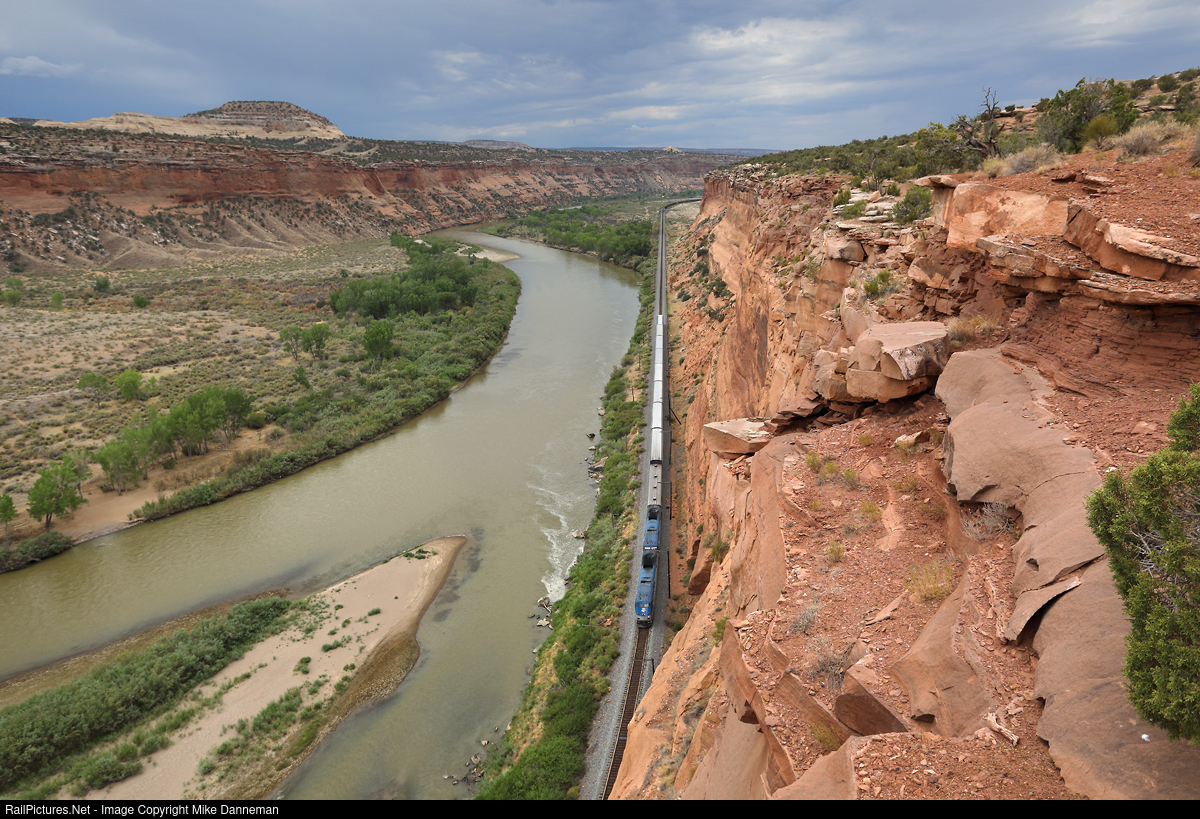Amtrak’s eastbound California Zephyr skirts the vertical sandstone cliffs the tower above the Colorado River in Ruby Canyon. The train has just passed stored hoppers in the siding at Utaline, Colorado, on June 24, 2021, and will soon be making its station stop at Grand Junction.