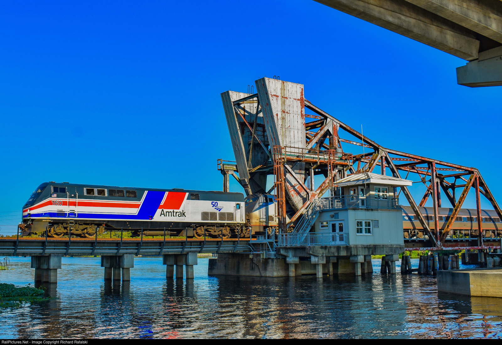 Amtrak 160, the newest addition to the 50th Anniversary Heritage fleet, rolls across the Lake Monroe drawbridge on the point of train P091-15. The "Pepsi Can" scheme is probably my favorite of all the heritage units Amtrak has released.