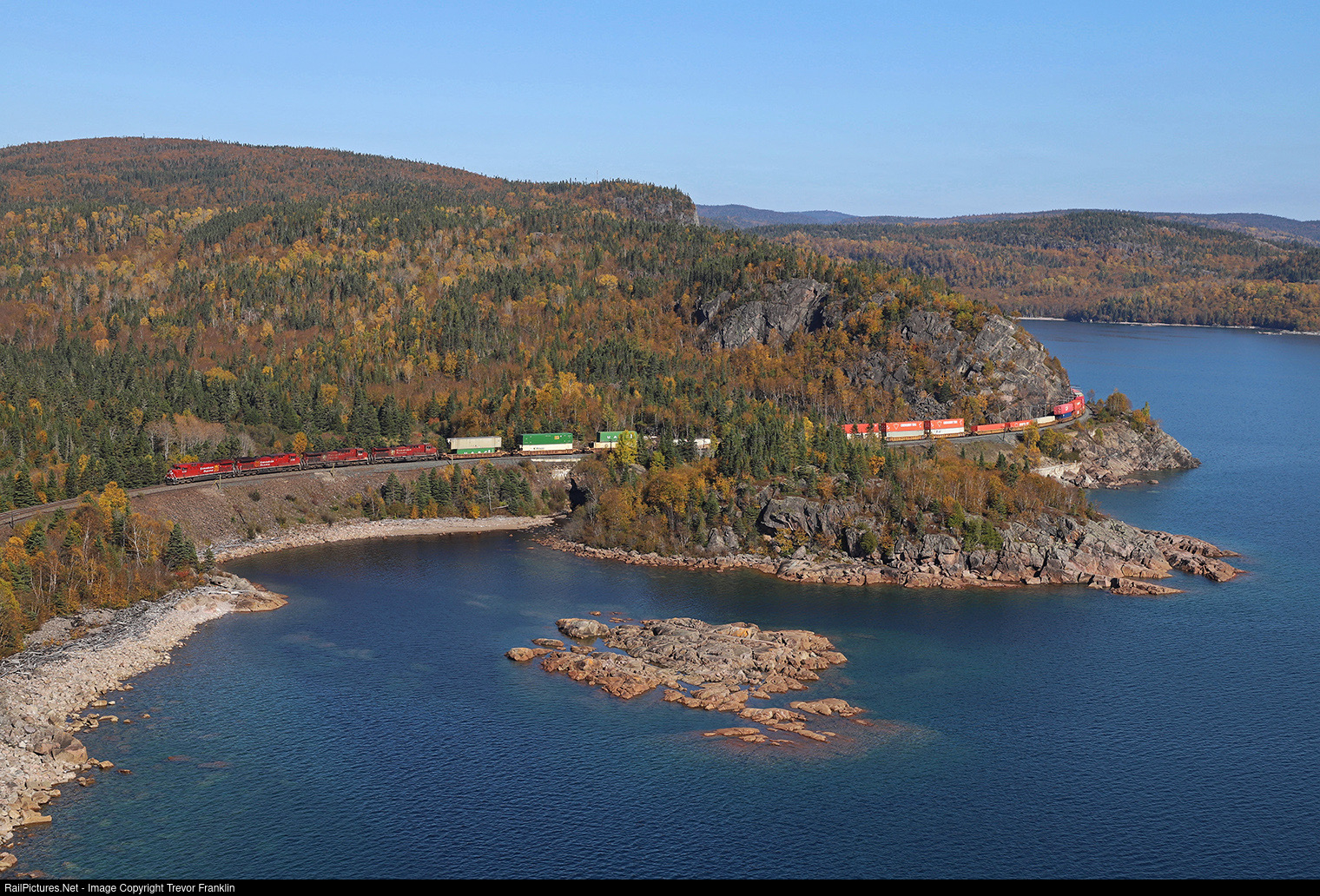 A pair of clean CWM’s are teamed up with a couple more GEs in charge of hotshot 101’s train today. Here it’s seen winding it’s way around Mink Harbour in the late afternoon sun amid the greens and golds, on a cloudless fall day along the north shore of Lake Superior.