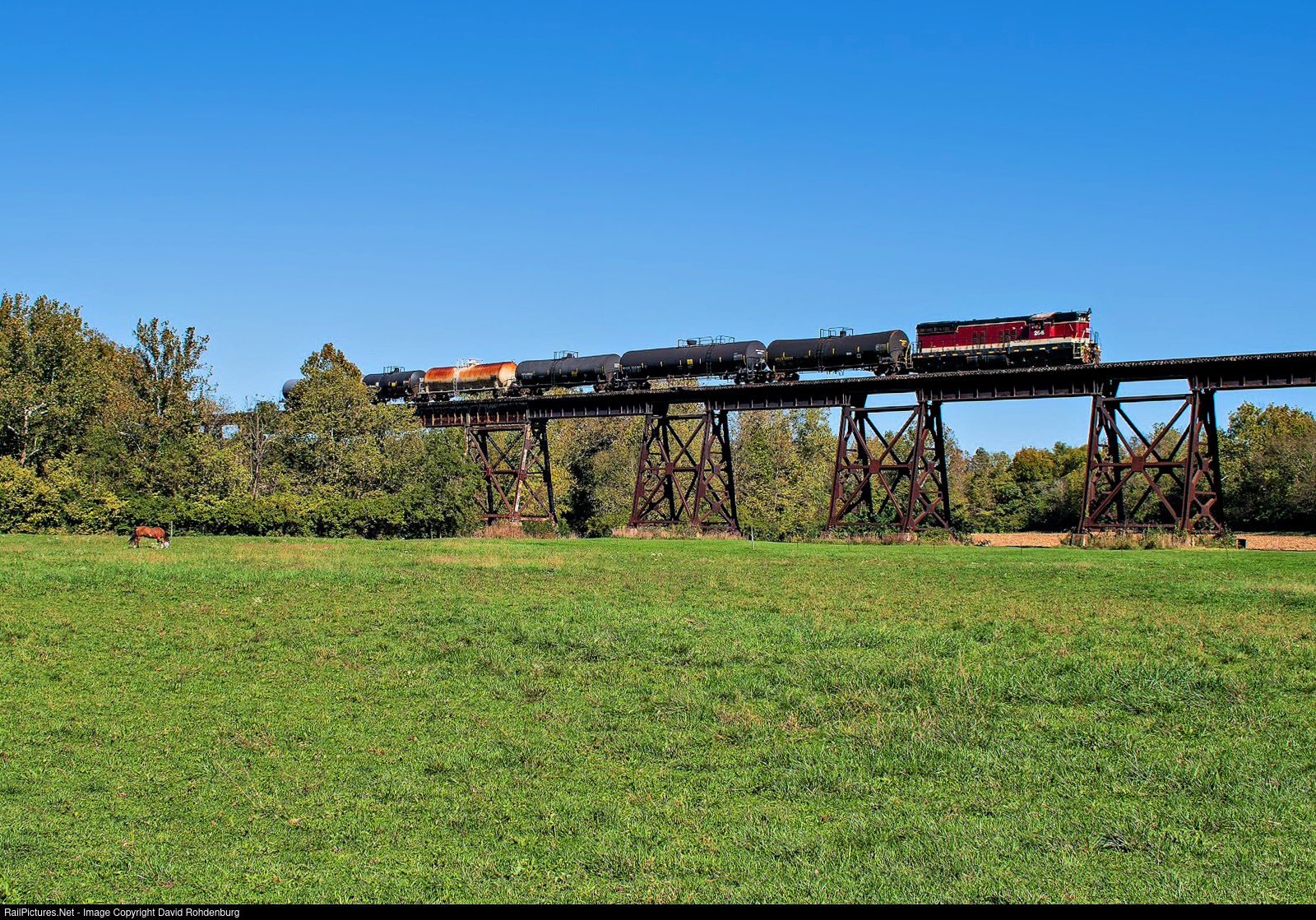 | The one shot that everyone wants on the IERR is of a train crossing the large trestle at Okeana, so with the SD9 leading, this one was a no-brainer. A horse grazing in the field below barely notices as IERR 206 and a short train of tank cars takes to the sky on the Okeana Trestle. |