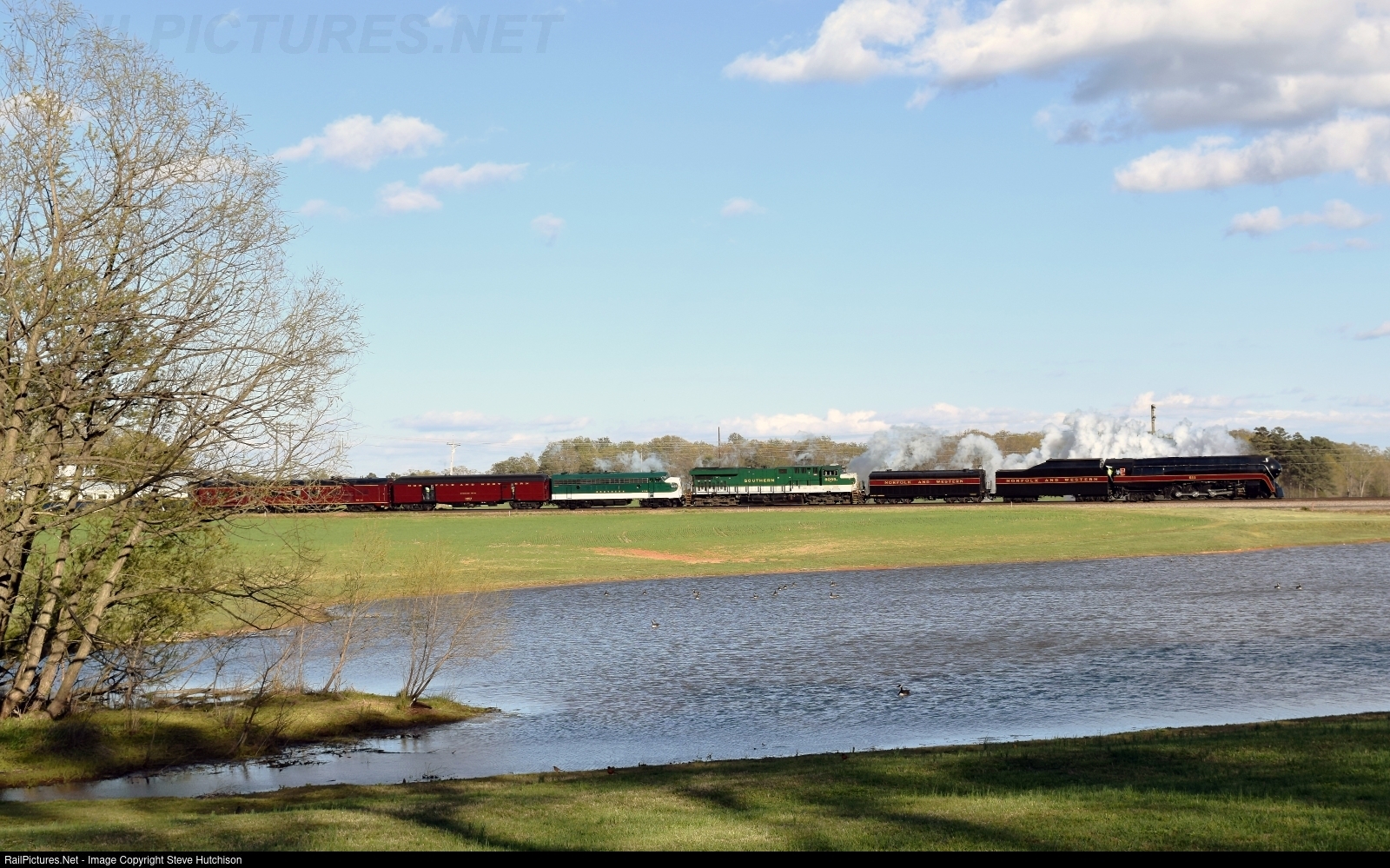 | Is it real or is it a model railroad diorama? N&W 611 is rolling southbound through Gretna VA returning to Greensboro NC from Lynchburg VA. Assisting 611 is the NS 8099 ES44AC Southern Heritage unit and Southern FP7 6133 from the North Carolina Transportation Museum. |