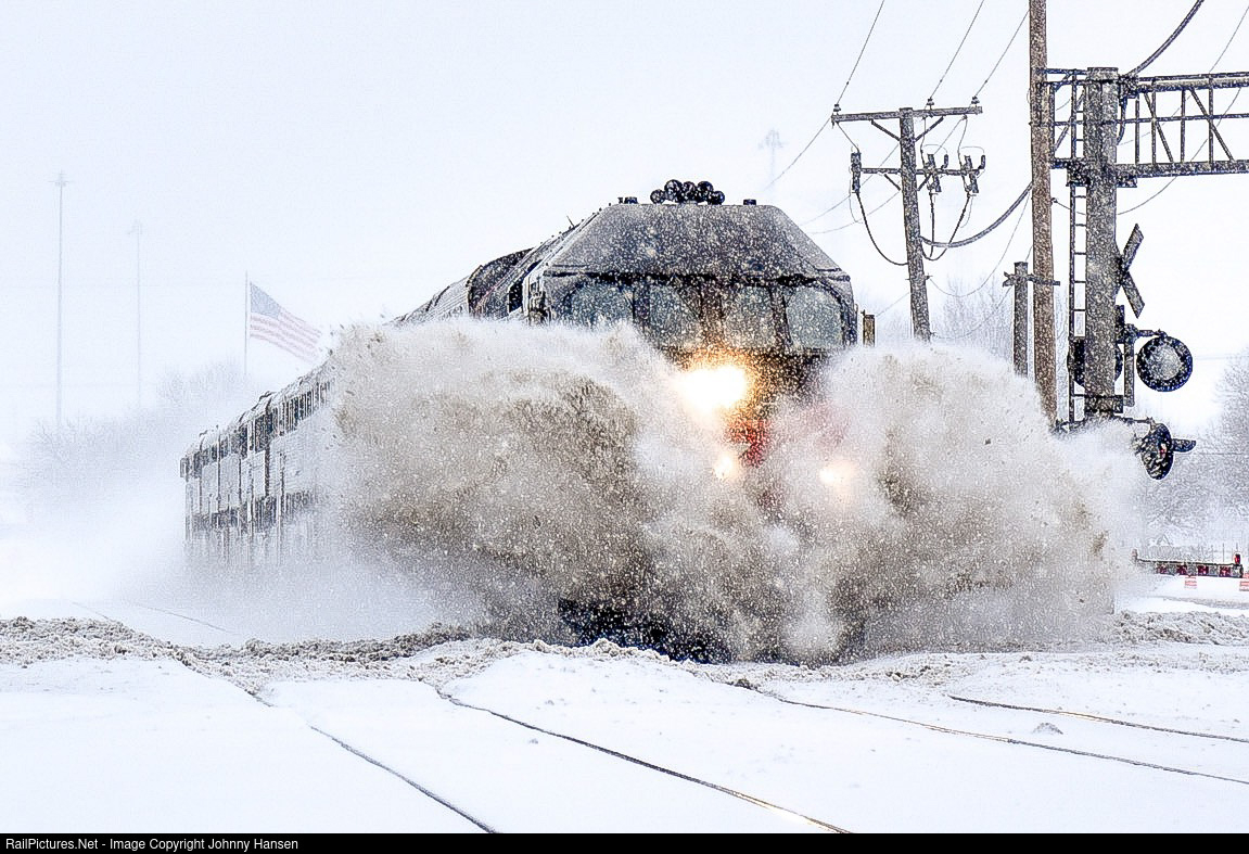 | Metra 113 heads west across Gougar Rd with MP36PH-3S 424 leading the way for Joliet, while doing every bit of trackspeed plowing its way through a plow line from the previous nights snowstorm which left a foot of snow. |